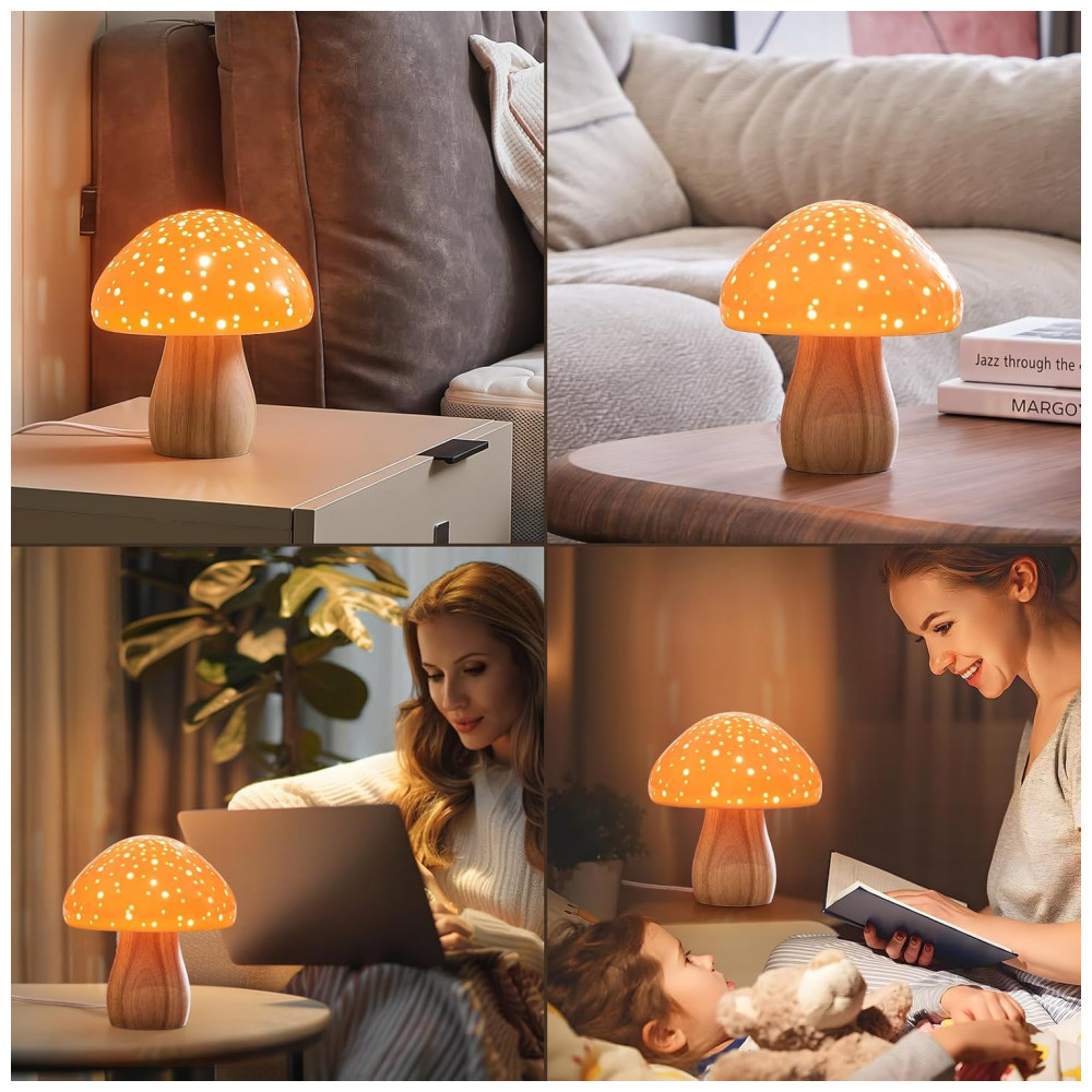 A Luminária Cogumelo BOHON em cerâmica estilo retrô na cor laranja vibrante traz um charme único e aconchegante para sua decoração. Com uma lâmpada LED E12 de luz branca quente (2700K) inclusa, ela oferece uma iluminação suave e confortável, perfeita para quartos, salas de estar, escritórios ou quartos infantis. Seu design inspirado em cogumelos combina um visual moderno e fofo com uma base sólida de madeira, garantindo durabilidade e elegância.