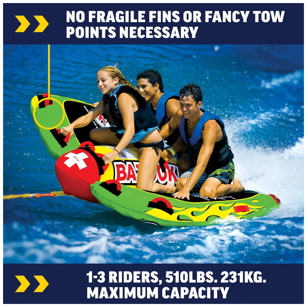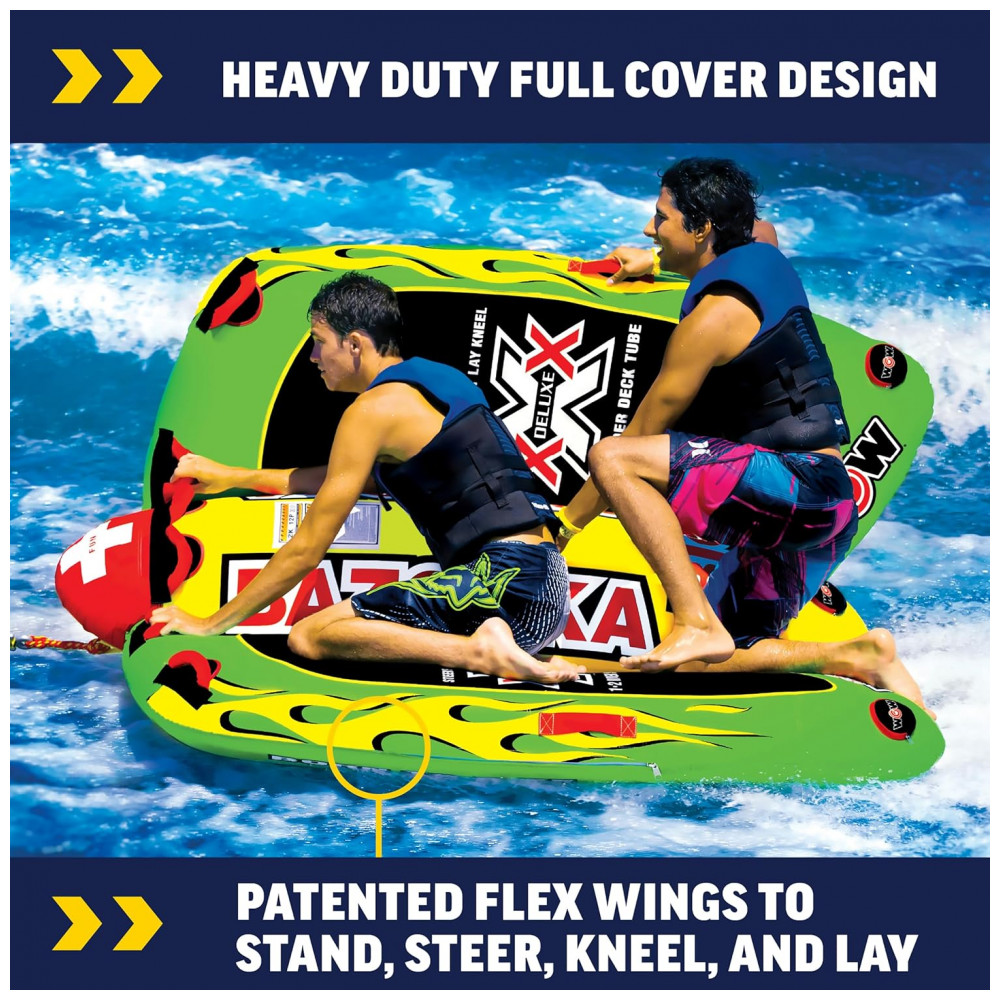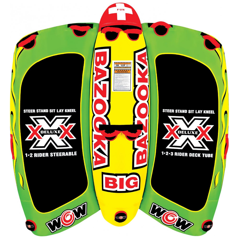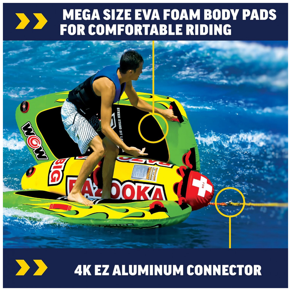 Tubo de convés multifuncional você pode deitar, sentar, ajoelhar, ficar de pé e fazer rolos de barril, sem a necessidade de barbatanas frágeis ou pontos de reboque sofisticados. A WOW desenvolveu um tubo de convés mais emocionante e multifuncional com opções, o Big Bazooka