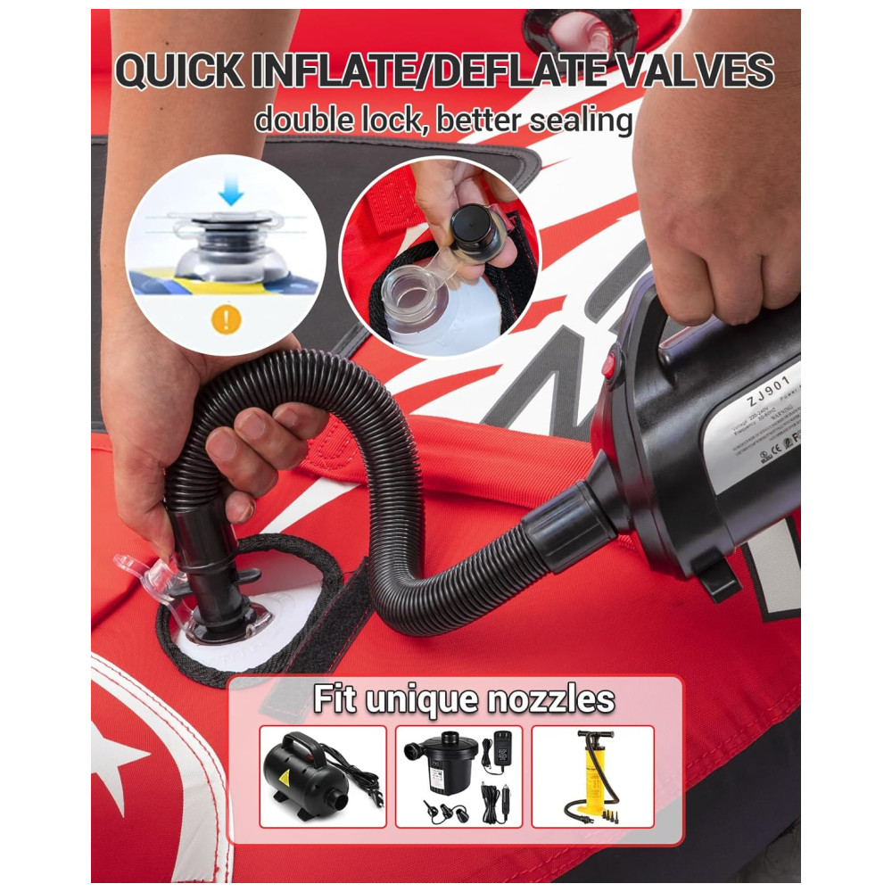 SISTEMA DE REBOQUE ULTRA-RÁPIDO: O conector de reboque frontal é resistente e permite uma conexão rápida com a corda de reboque em apenas 30 segundos. Equipado com uma válvula de segurança de velocidade, a inflação e desinflação do tubo são rápidas e fáceis, tornando o processo de preparação mais ágil. Este tubo é compatível com as bombas exclusivas do mercado, facilitando ainda mais o uso.