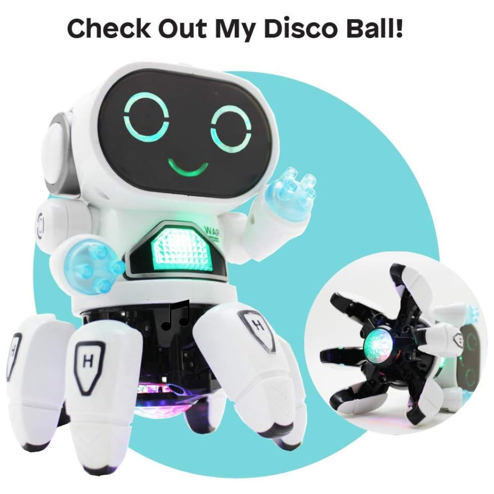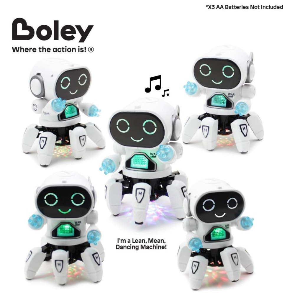O QUE ESTÁ DENTRO Boley Pioneer Robot em Bright Blue vai iluminar a pista de dança com 3 melodias de dança com graves, uma barriga de bola de discoteca com luzes multicoloridas piscando e um rosto bonito iluminado com braços e pernas que se movem com a música Basta adicionar 3 pilhas AA, desligar o interruptor e ele vai