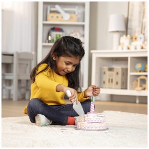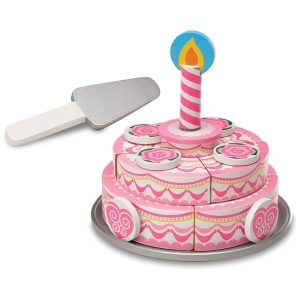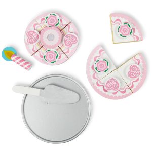 O conjunto inclui 8 fatias de bolo, 8 coberturas misturadas, prato de bolo, faca de servir e vela. A construção de madeira é resistente e incentiva a coordenação olho mão, expressão criativa e brincadeiras imaginativas.