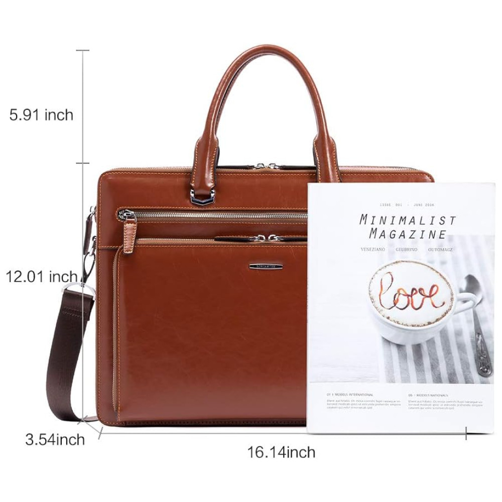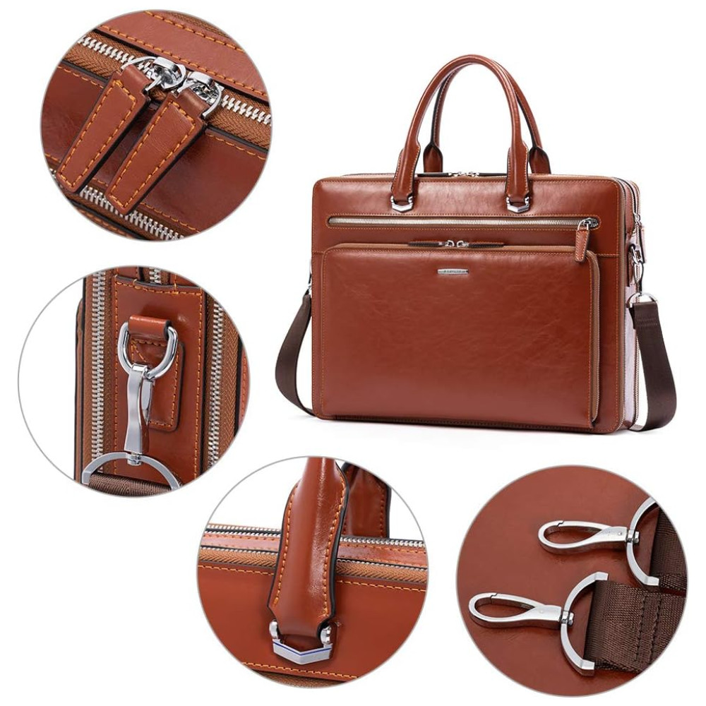 Alta qualidade – A pasta de couro é feita do melhor couro de cera de óleo de grão superior e durável. Forro de tecido durável com ferragens prateadas resistentes. Os zíperes são duradouros e anti-quebra. Possui alça de ombro removível e ajustável com almofada acolchoada.