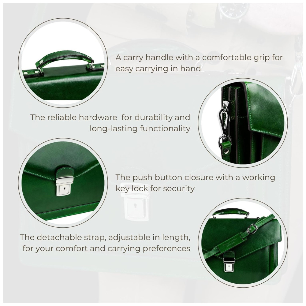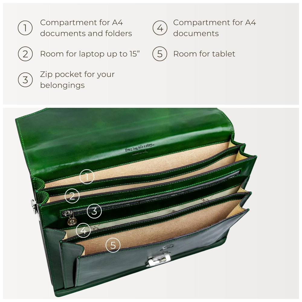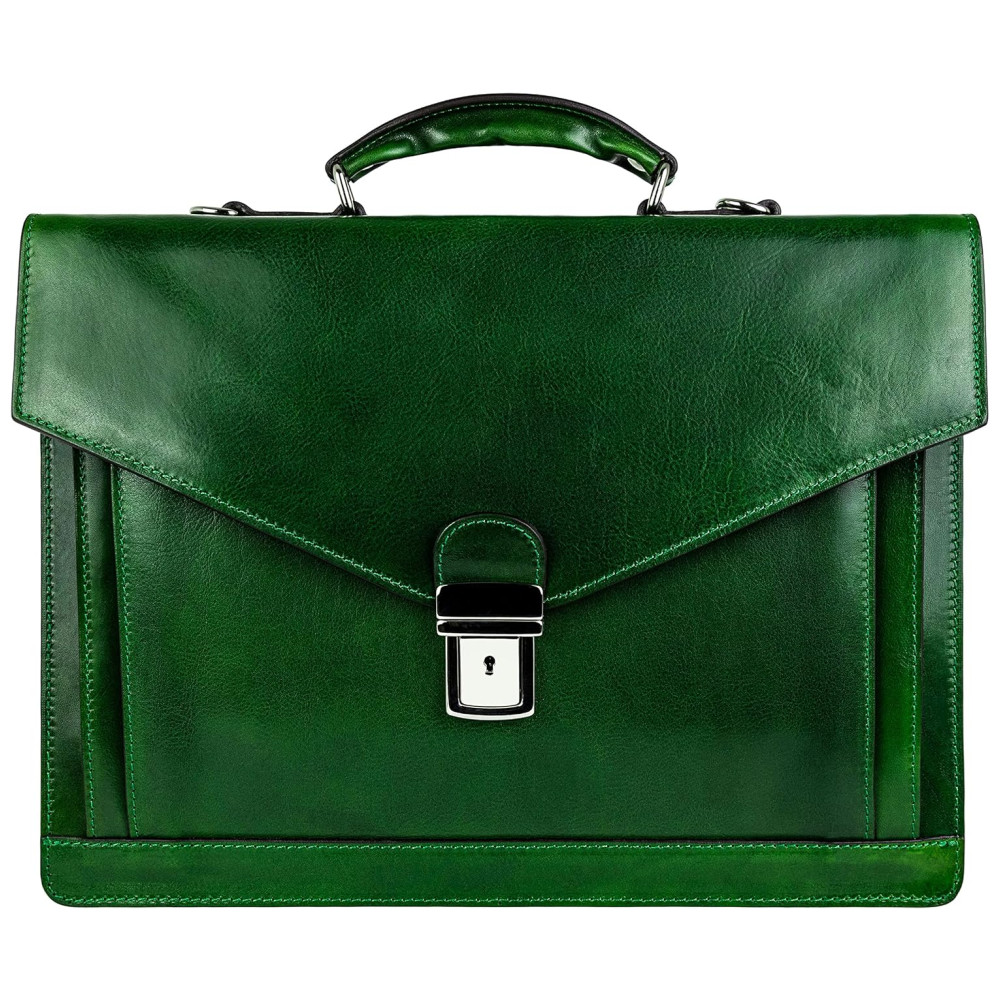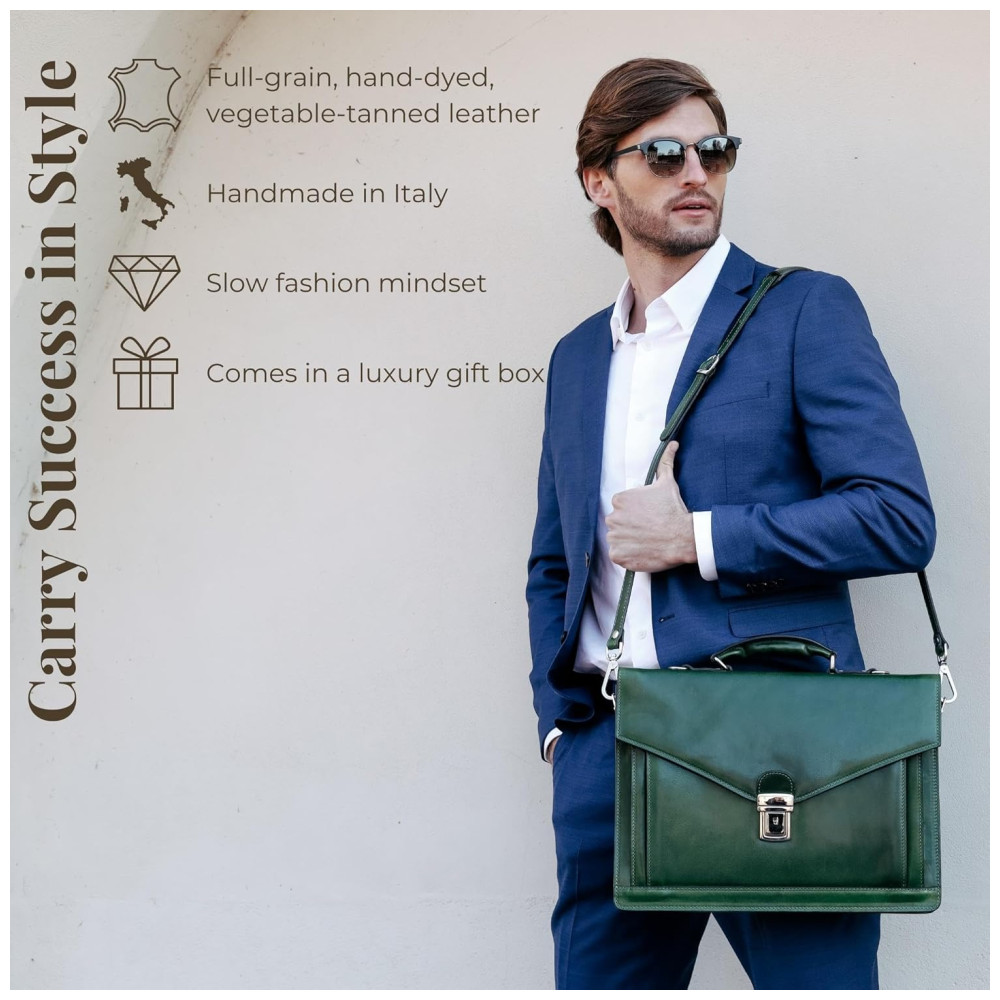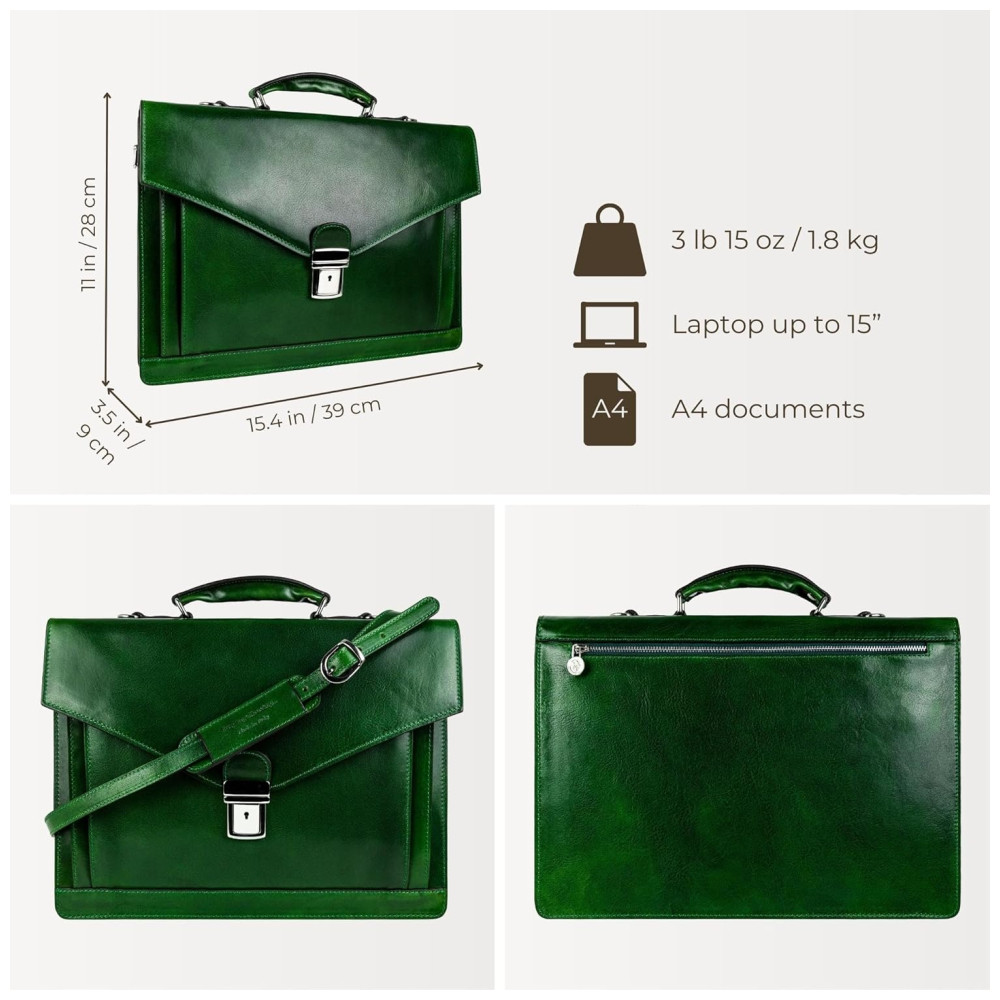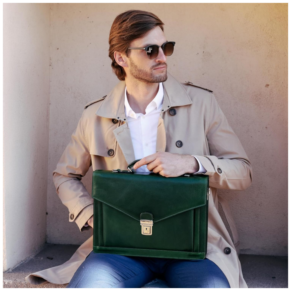 Bolsa Carteiro Masculina de Couro Artesanal Italiano para Laptop com 15 Polegadas e Fecho em Zíper Time Resistance Verde