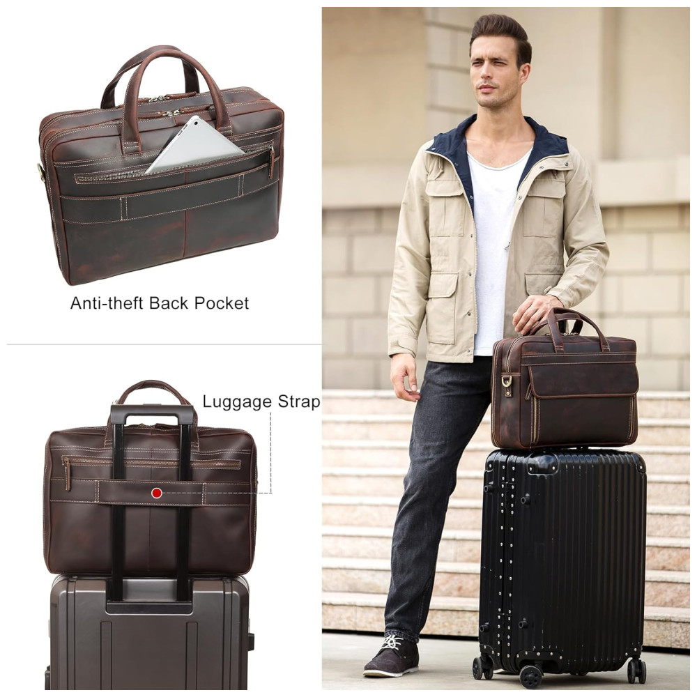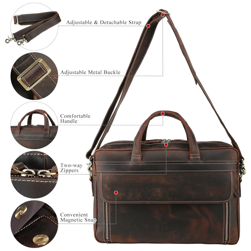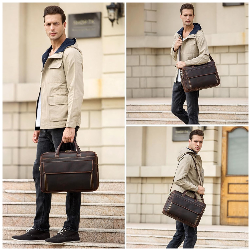 Alta qualidade – Esta pasta para laptop é feita de couro bovino de flor integral, equipada com ferragens robustas e zíper de metal YKK resistente. Cada peça do zíper YKK pode passar no teste de resistência à tração 1000 vezes. O novo zíper é um pouco apertado no início para prolongar sua vida útil e ficará mais liso com o tempo.