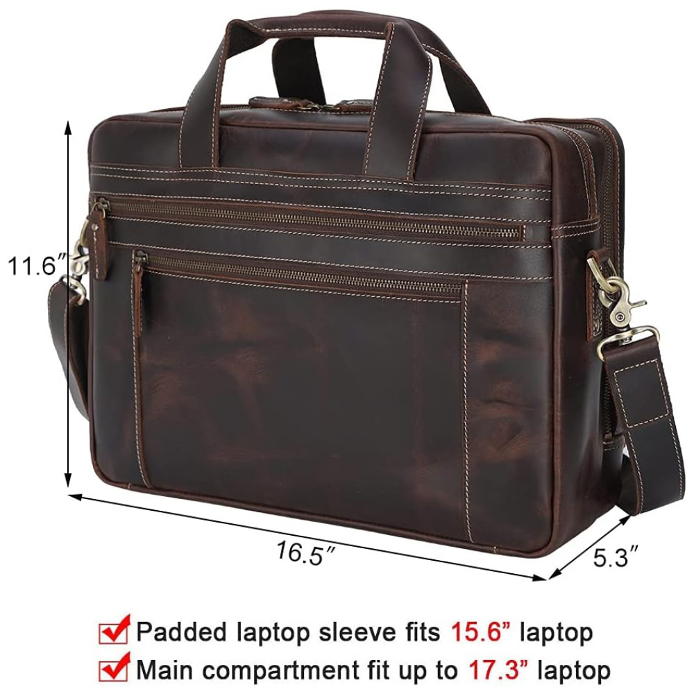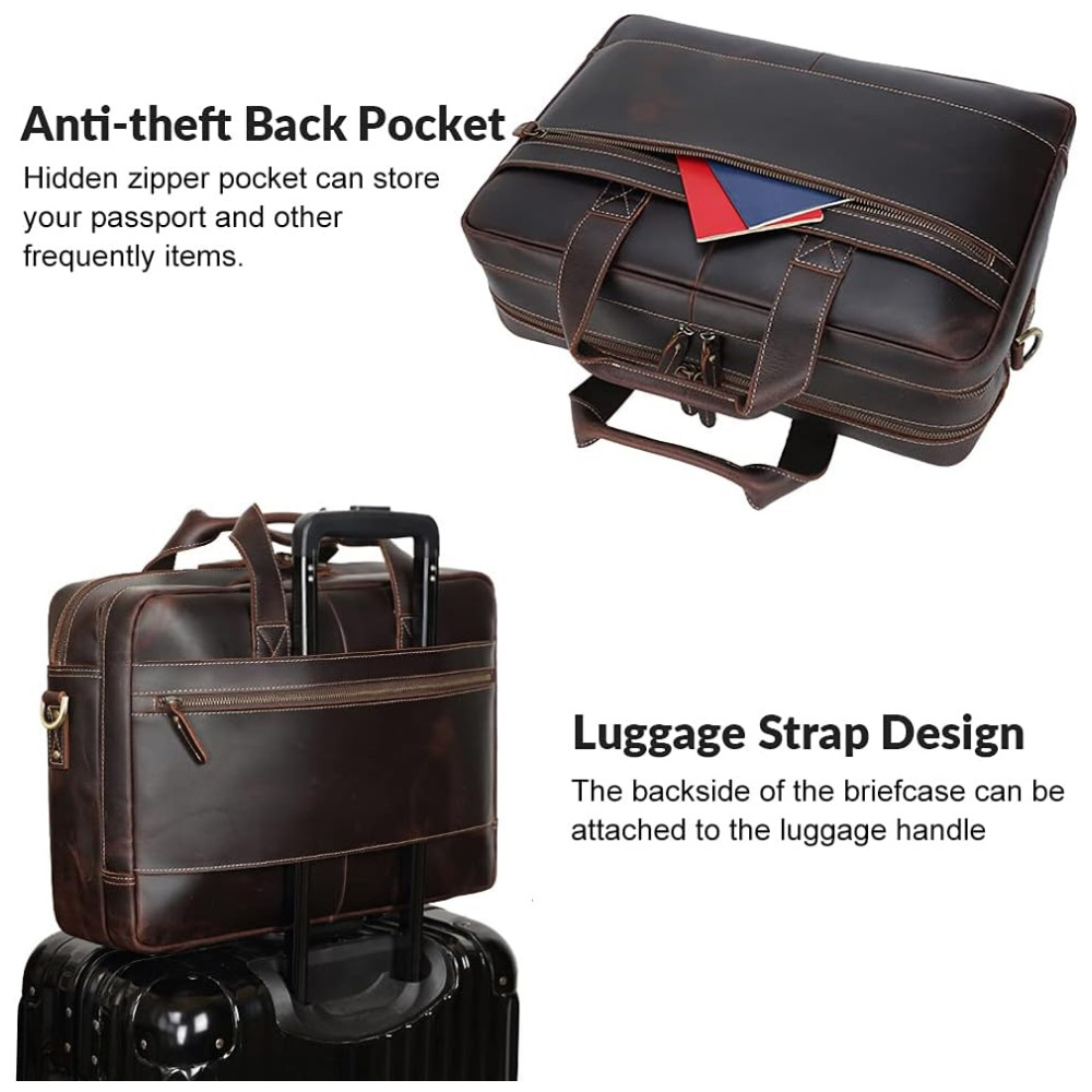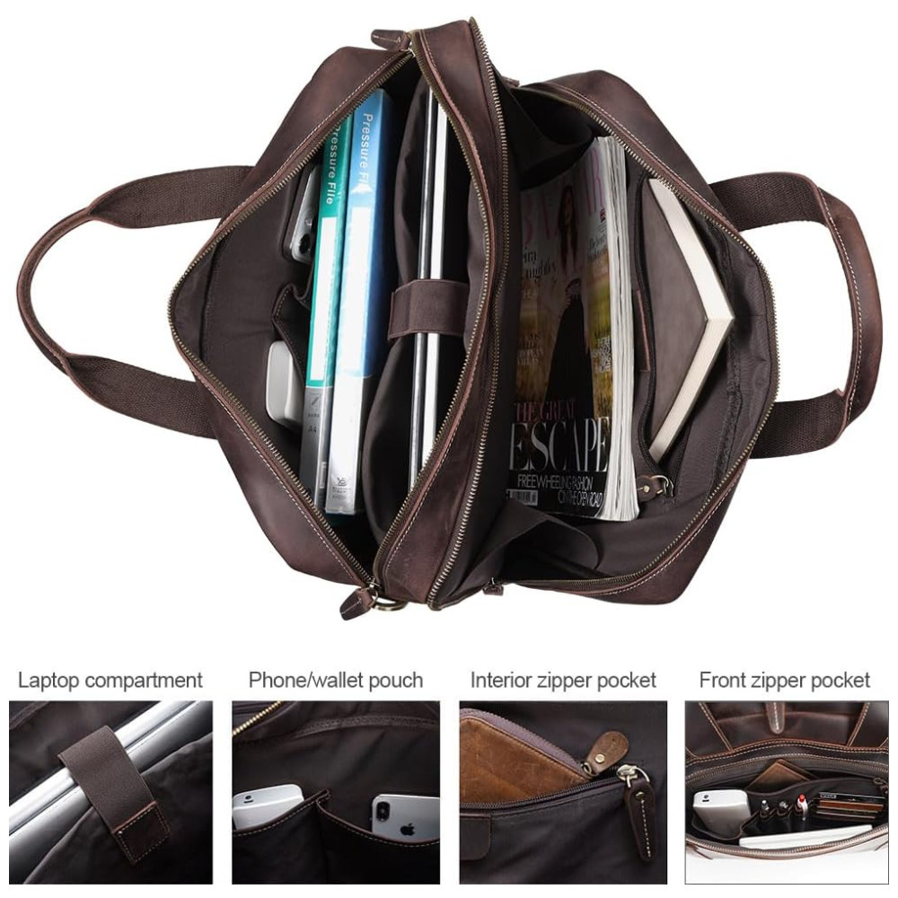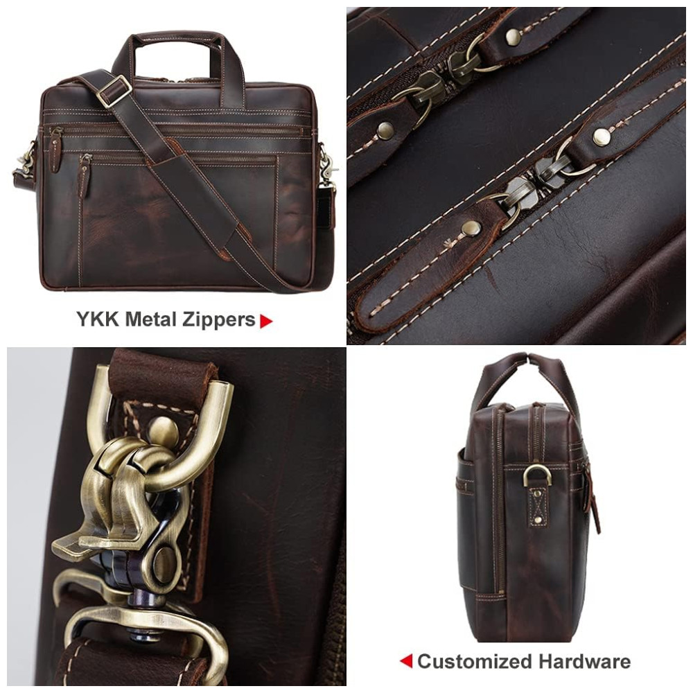 Armazenamento espaçoso: Possui dois compartimentos grandes, dois bolsos frontais com zíper, dois bolsos internos com zíper, três bolsas internas, três porta-canetas, quatro compartimentos para cartões e um bolso traseiro com zíper. A pasta de couro vintage é perfeita para suas viagens diárias de trabalho e de negócios.