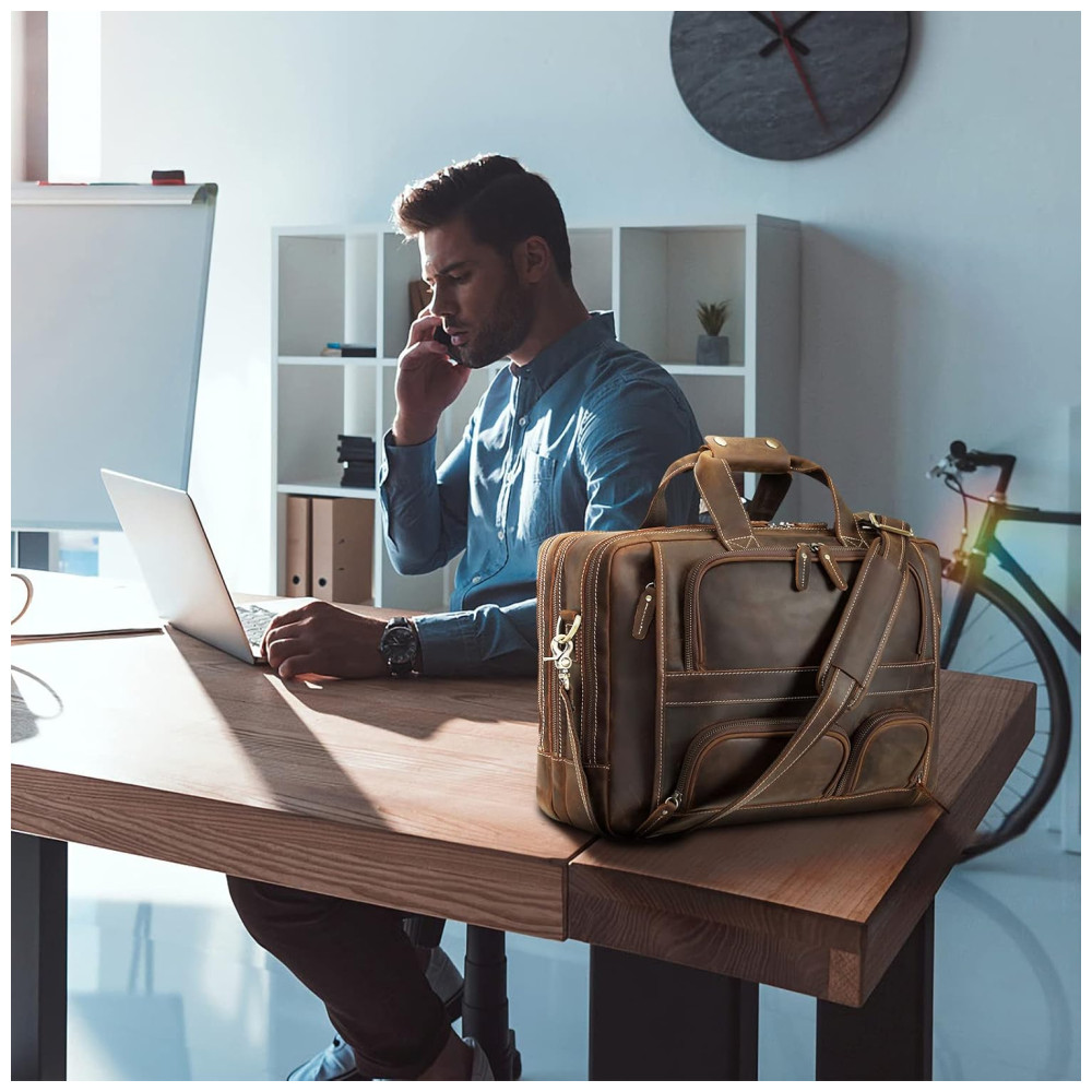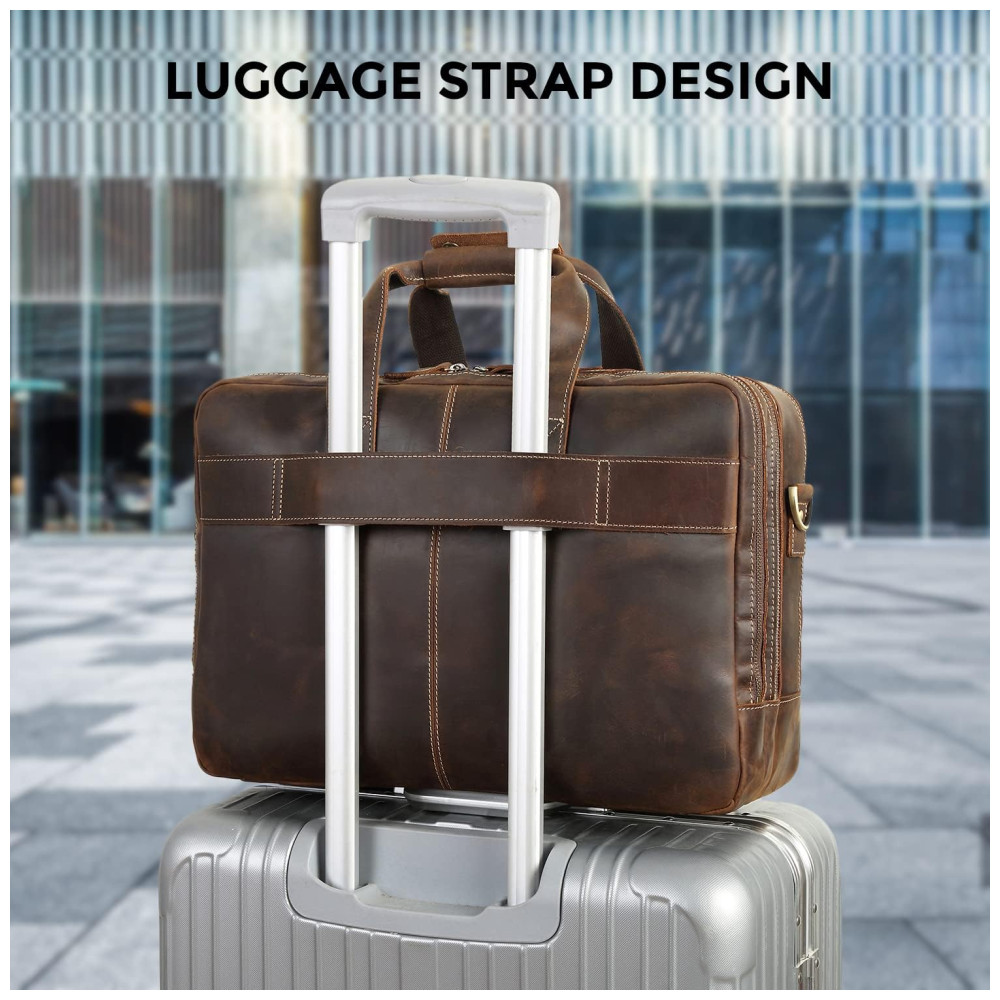 Há uma alça de bagagem na parte de trás da bolsa que pode ser colocada facilmente na sua bagagem, liberando suas mãos durante suas viagens de negócios.