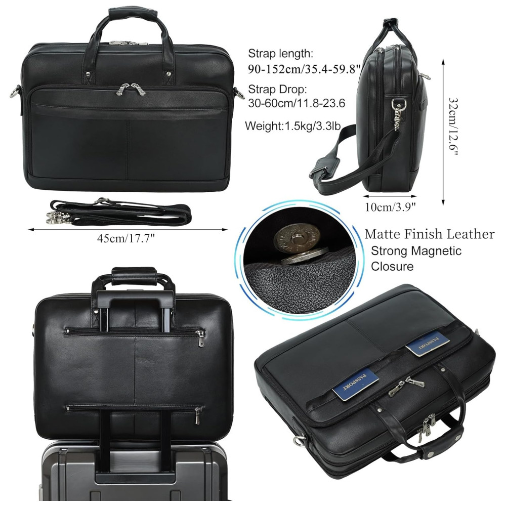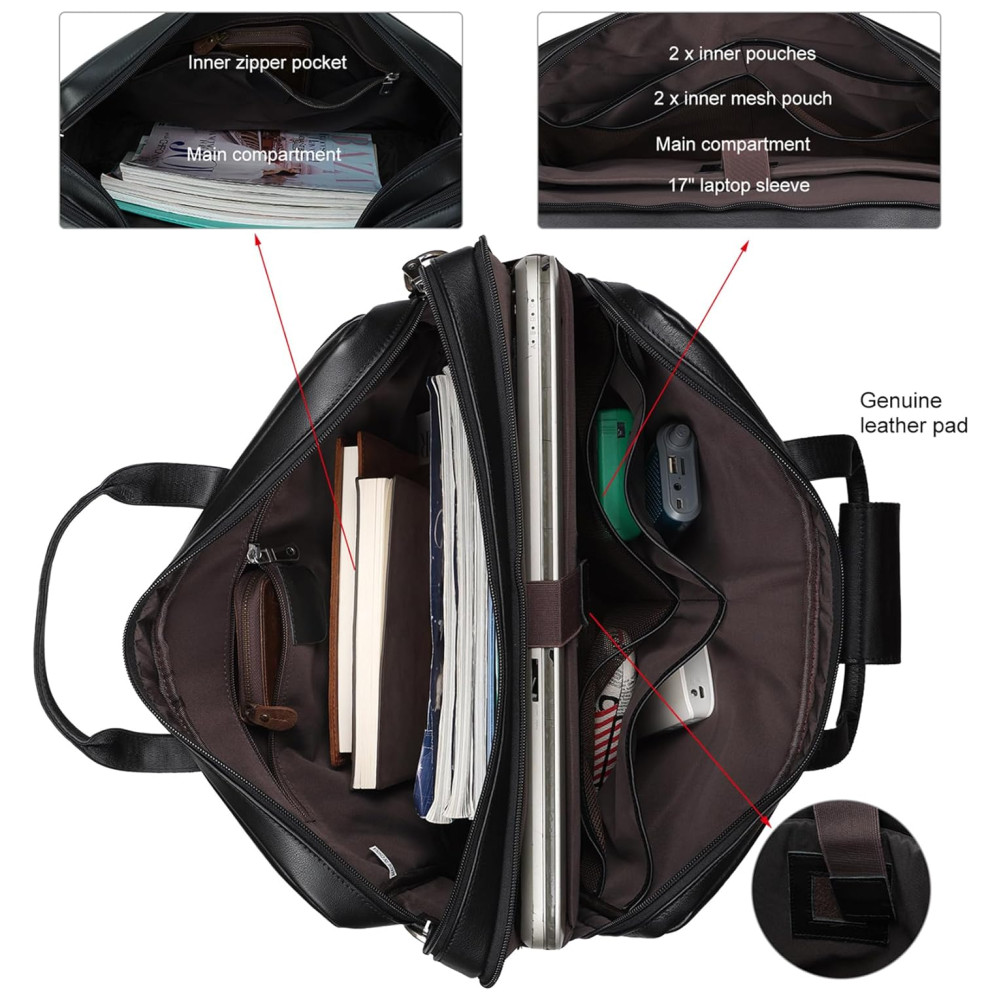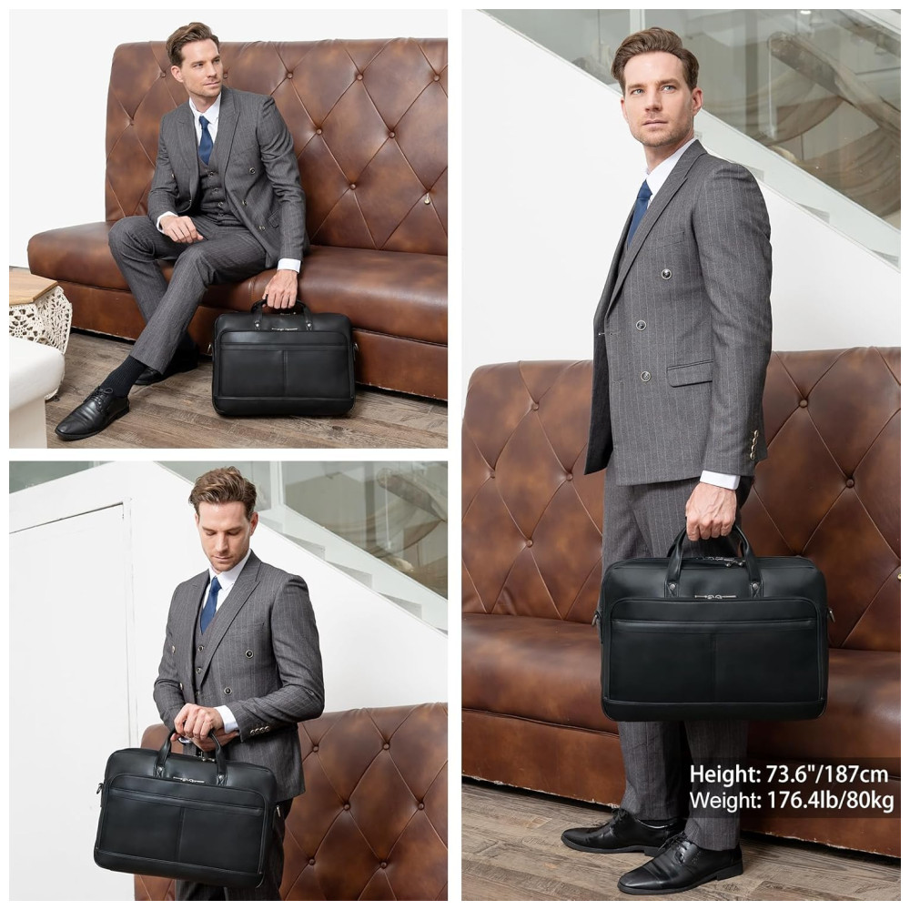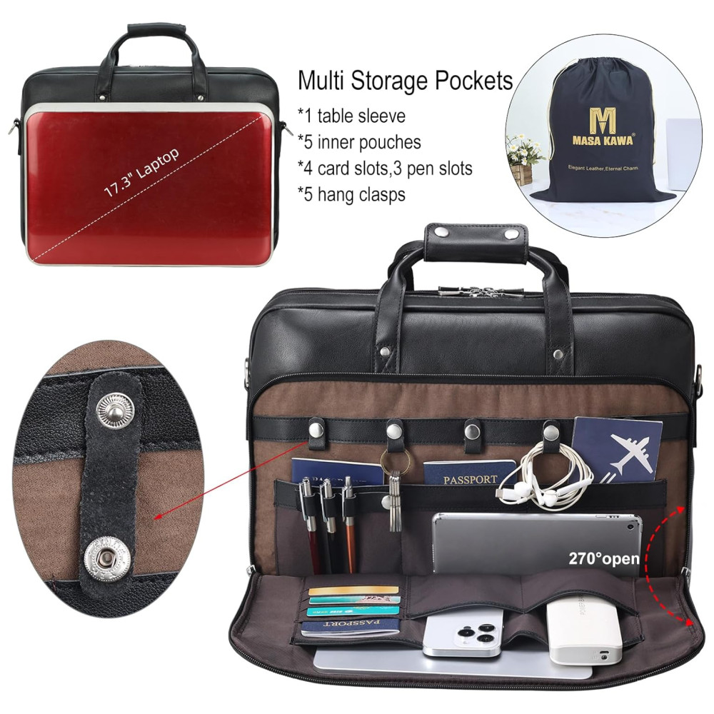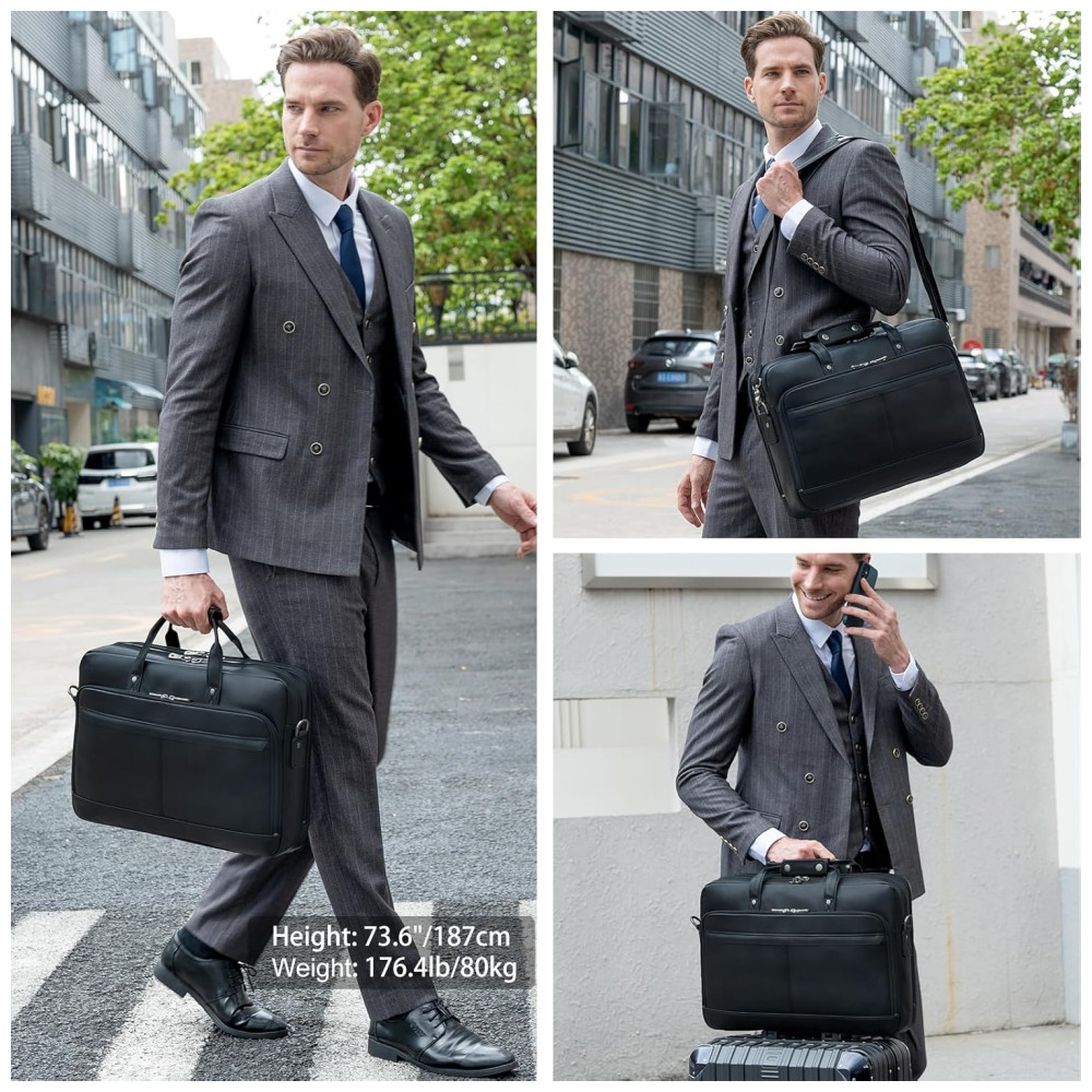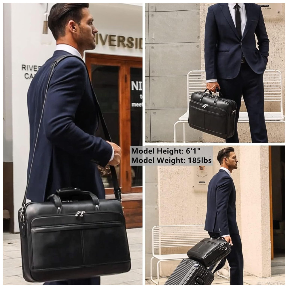 Durante longas viagens de negócios, você pode abrir os zíperes do bolso traseiro com zíper para permitir que seja uma alça de bagagem para pendurar a maleta na mala com rodinhas para liberar a fadiga do transporte e tornar a viagem mais fácil. No dia a dia, feche os zíperes para usar como bolso. A bolsa de couro pode ser transportada como bolsa de alça superior, pasta para laptop de 17″, bolsa de escritório para trabalho comercial, bolsa mensageiro de viagem, bolsa de ombro diária, pasta de professor ou advogado.
