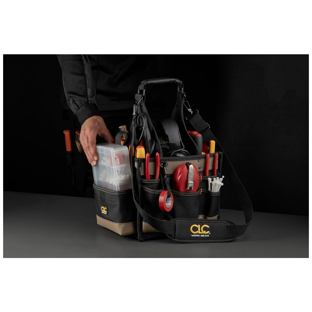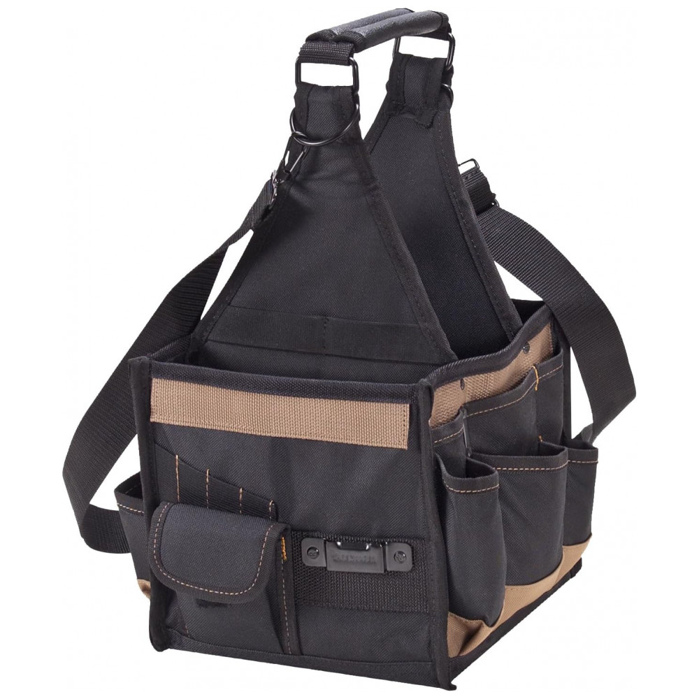 O design em forma de caixa evita o tombamento, bolsos para brocas e pontas, testadores, alicates, chaves de fenda, etc.