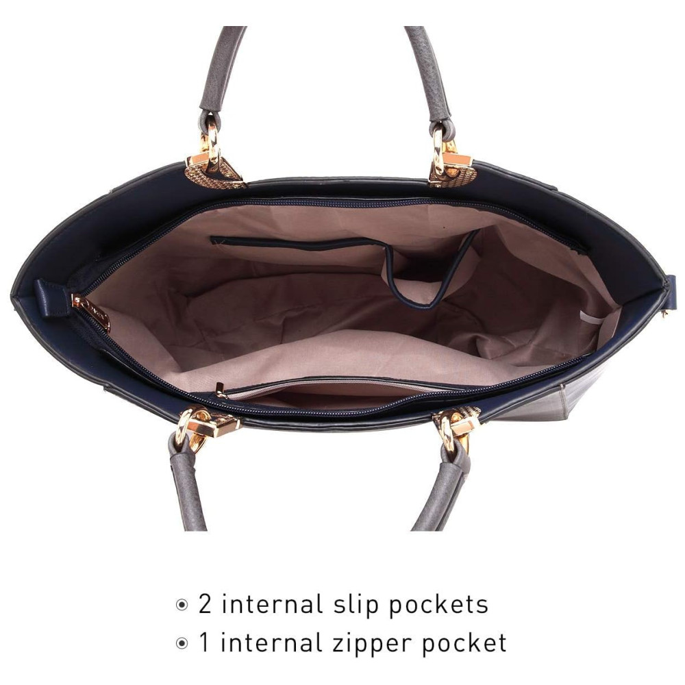 Design elegante Projeto de bloco de duas cores detalhado com ferragens em tom dourado de alta qualidade, zíperes e tachas inferiores. As alças superiores em couro laminado são muito confortáveis para transportar e são especialmente reforçadas por uma decoração de metal durável.