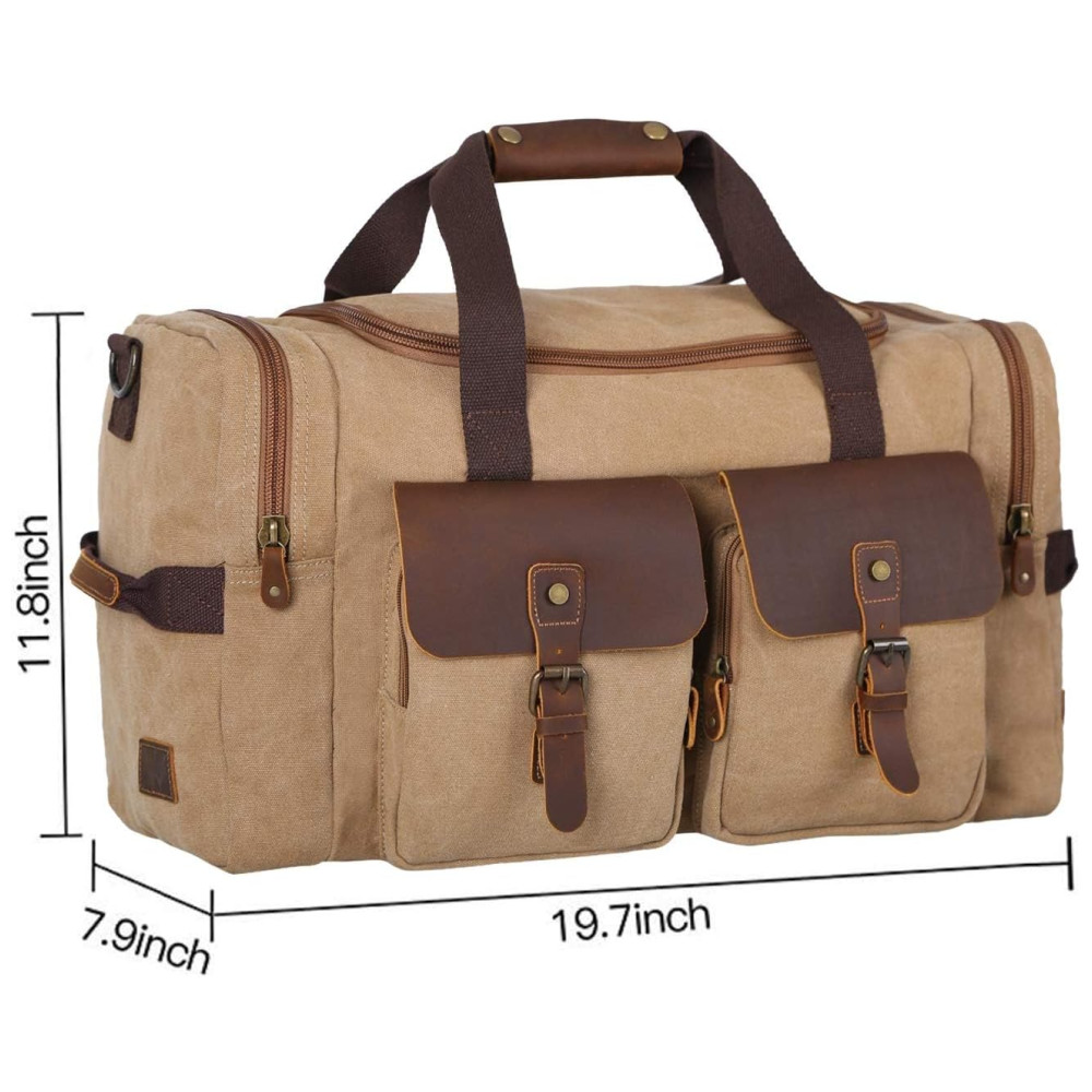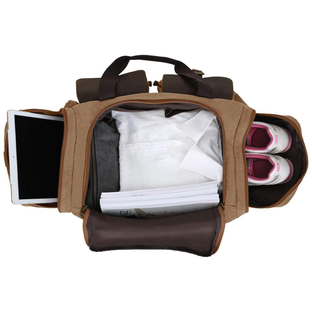 A mochila unissex isWOWBOX possui um compartimento exclusivo para sapatos para separar os sapatos de seus pertences de higiene pessoal. Esta robusta bolsa de viagem é feita de tecido de lona premium, couro de couro bovino e ferragens de metal resistentes. Obs Essa superfície de couro apresenta rugas desordenadas, cicatrizes, arranhões que apresentam um estilo retrô e selvagem.