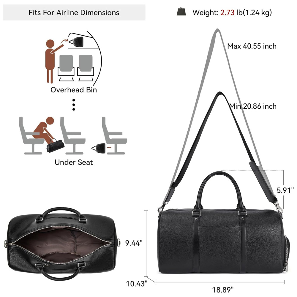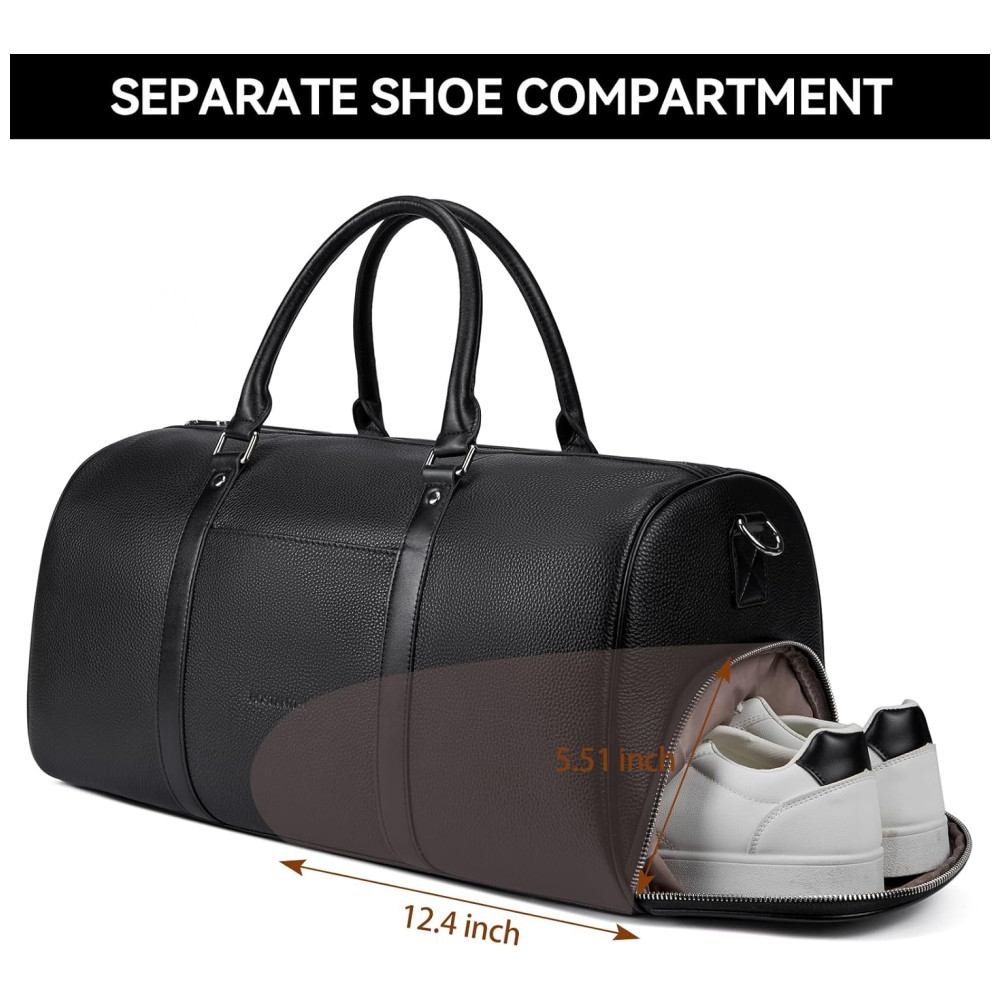 ESTRUTURA A mochila superdimensionada contém 1 grande compartimento interno, 1 bolso interno com zíper, 2 bolsos de inserção. Há um prático compartimento para sapatos com zíper. Esta bolsa de fim de semana comporta facilmente seu laptop de 15 polegadas, iPad, iPhone, roupas, sapatos e outras coisas. A bolsa de fim de semana é ideal para viagens de avião ou trem. A alça de ombro removível é ajustável e acolchoada para maior conforto.