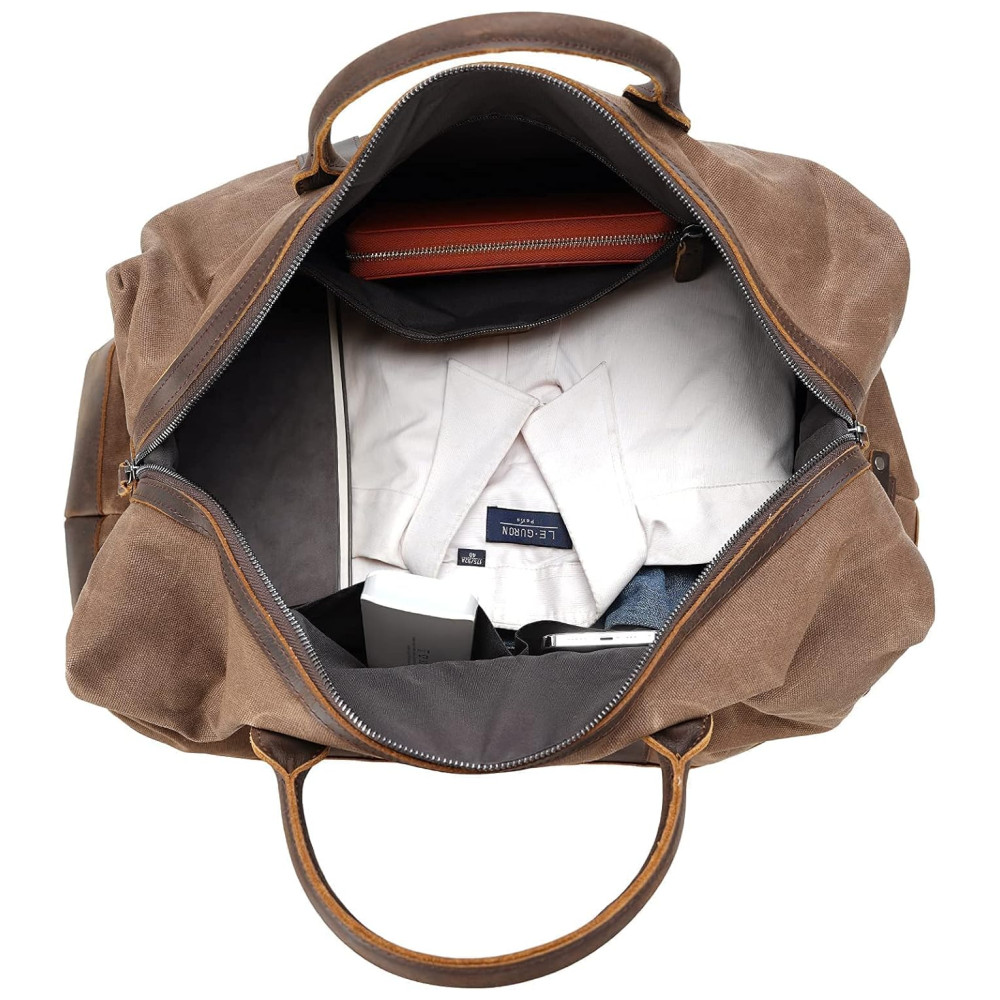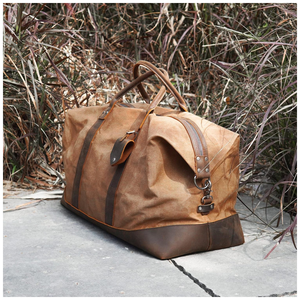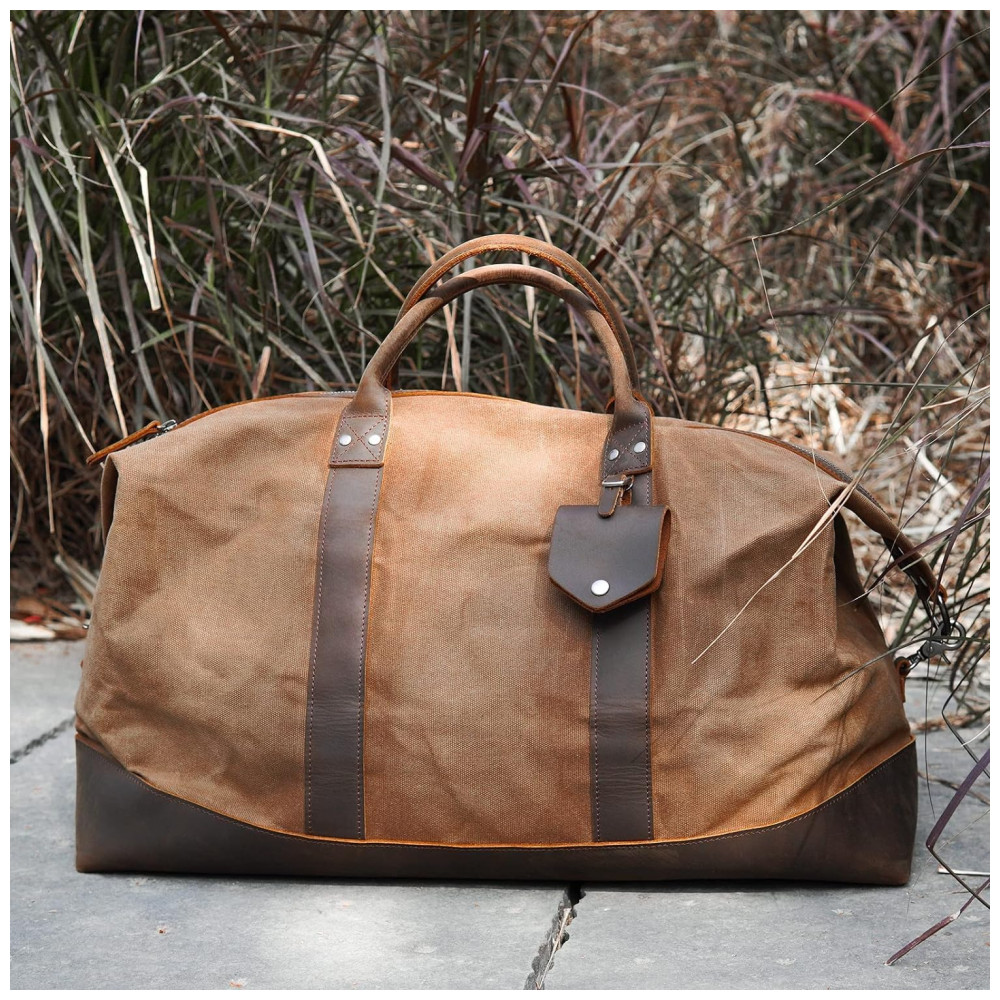 COURO DE COURO E LONA ENCERADA Nossa bolsa de viagem de couro é feita à mão com couro de vaca italiano e lona durável encerada. A qualidade premium garante a durabilidade de longa duração.