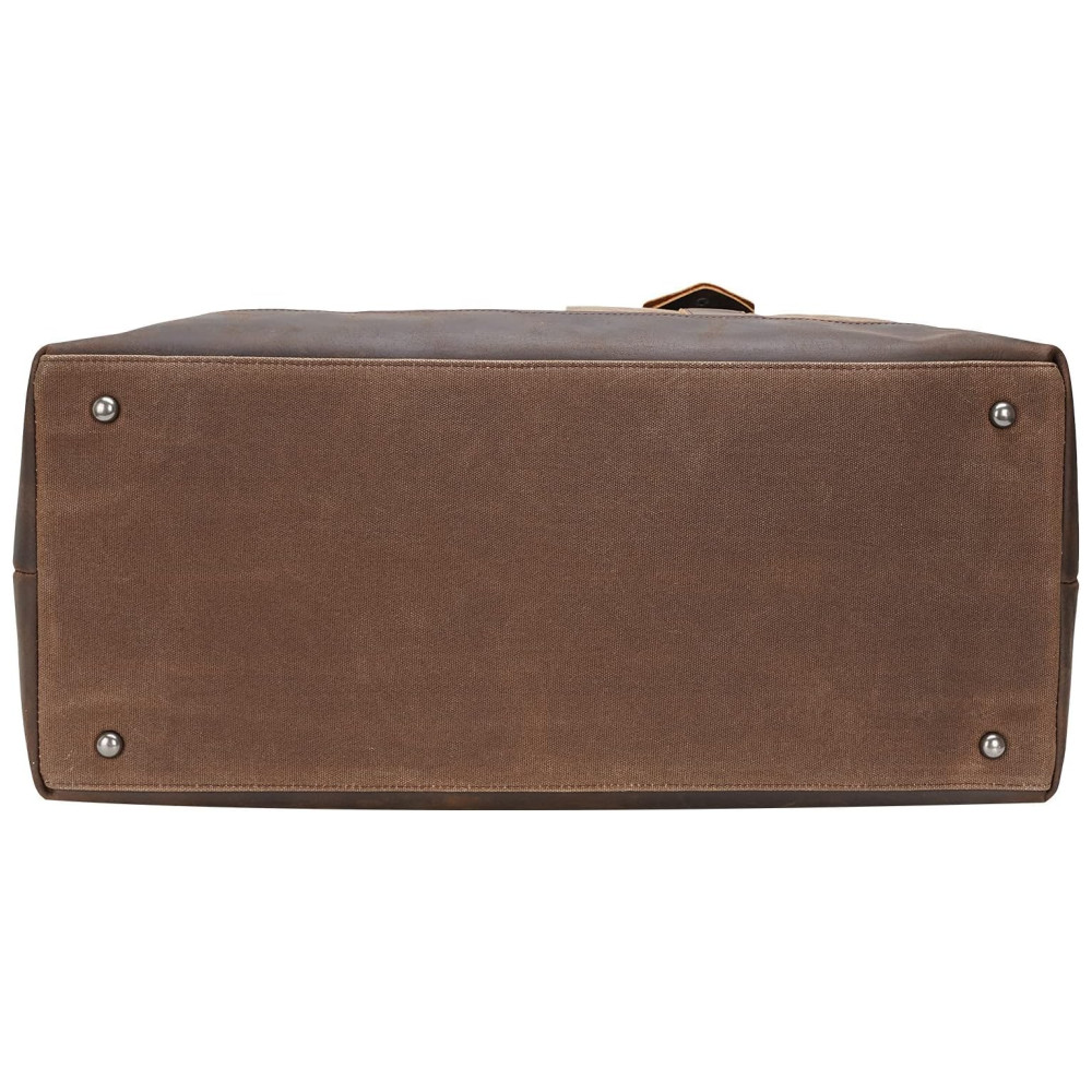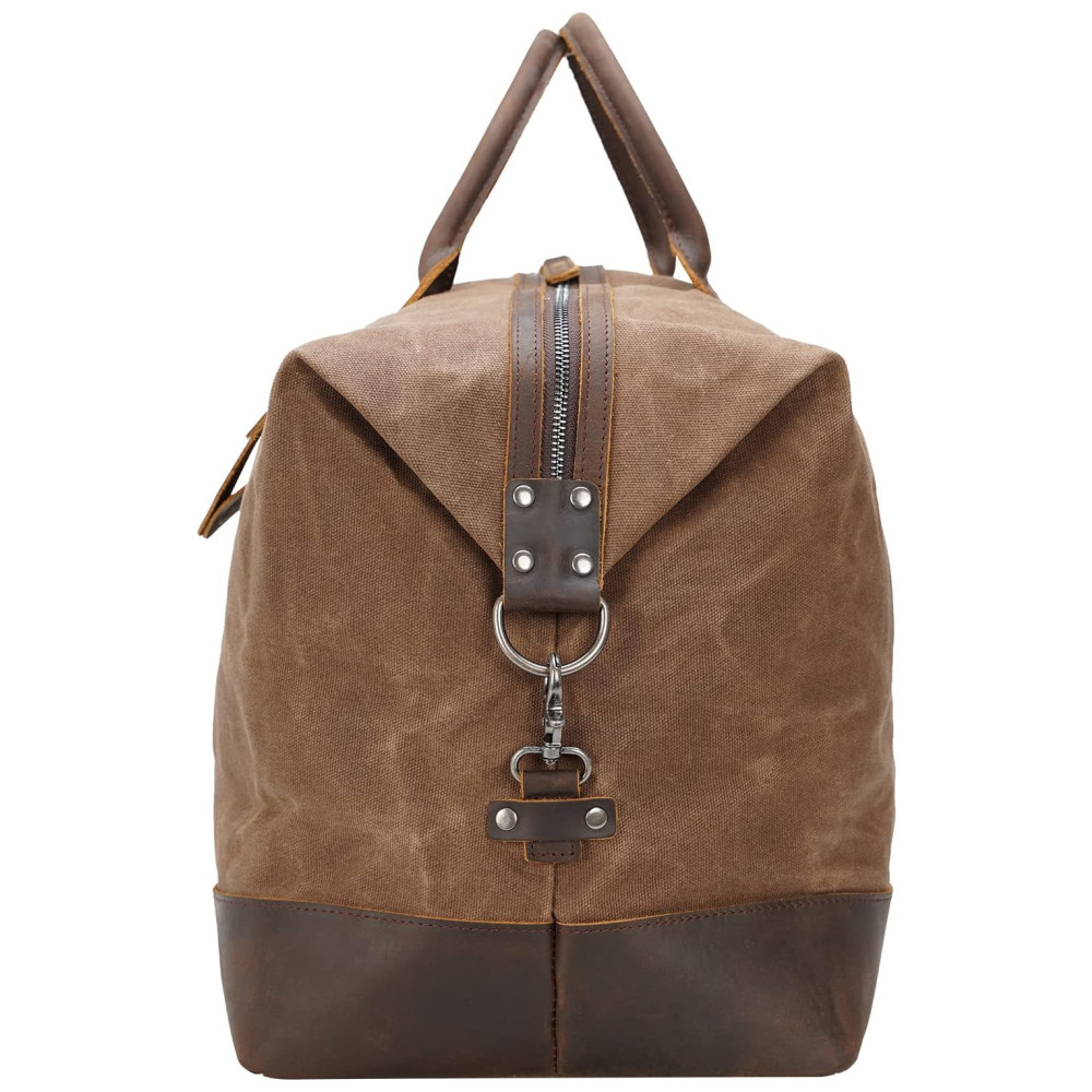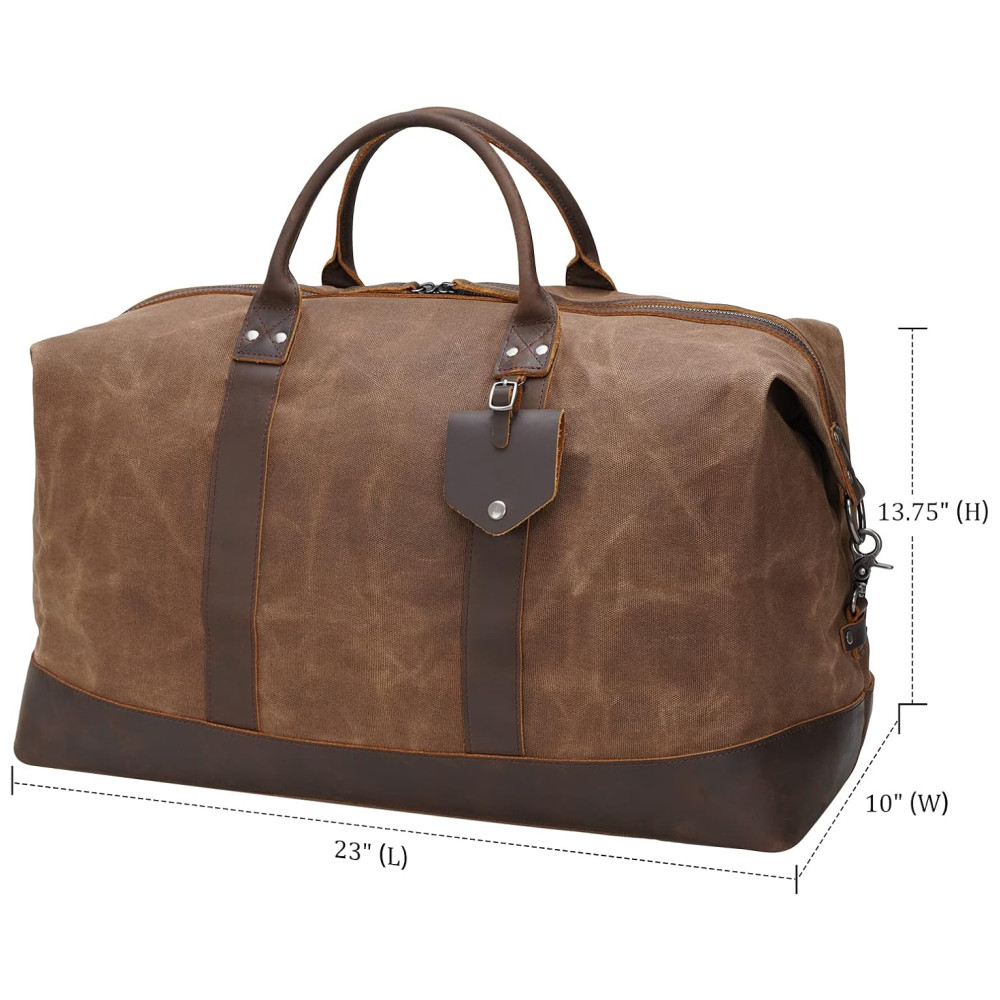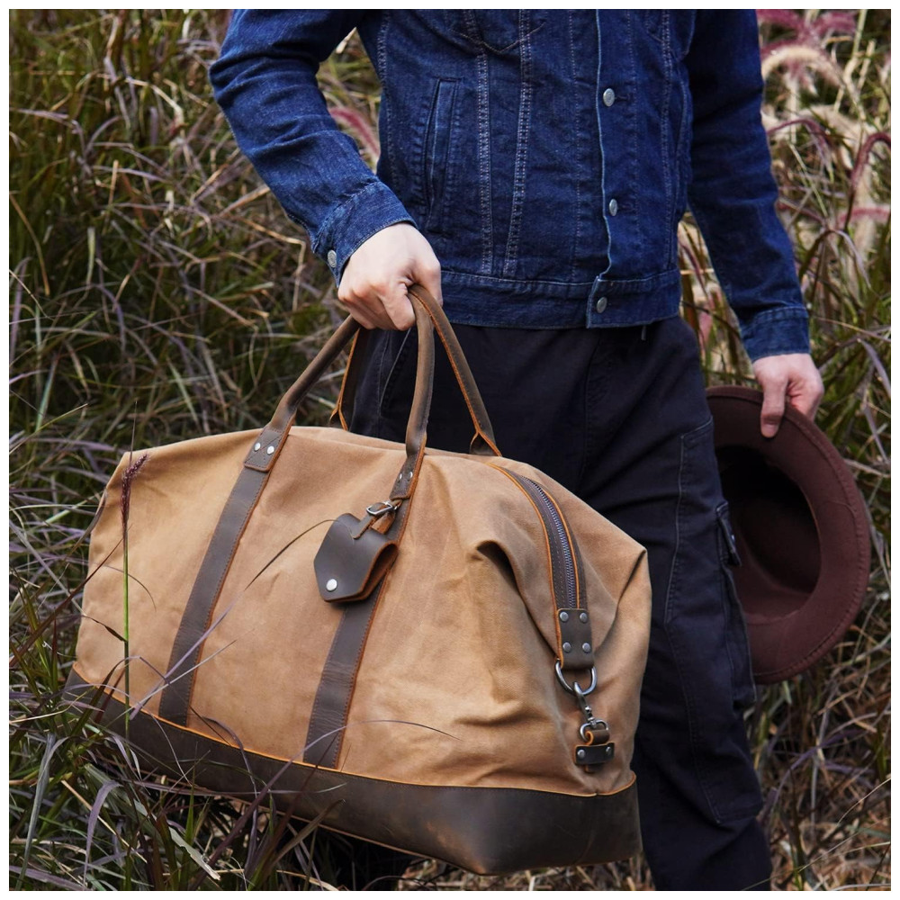 COURO DE COURO E LONA ENCERADA Nossa bolsa de viagem de couro é feita à mão com couro de vaca italiano e lona durável encerada. A qualidade premium garante a durabilidade de longa duração.