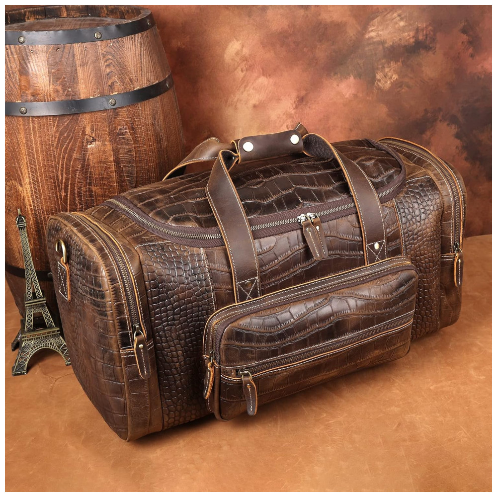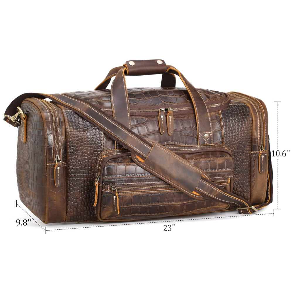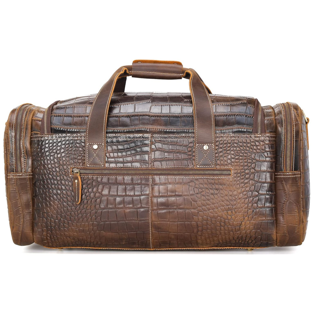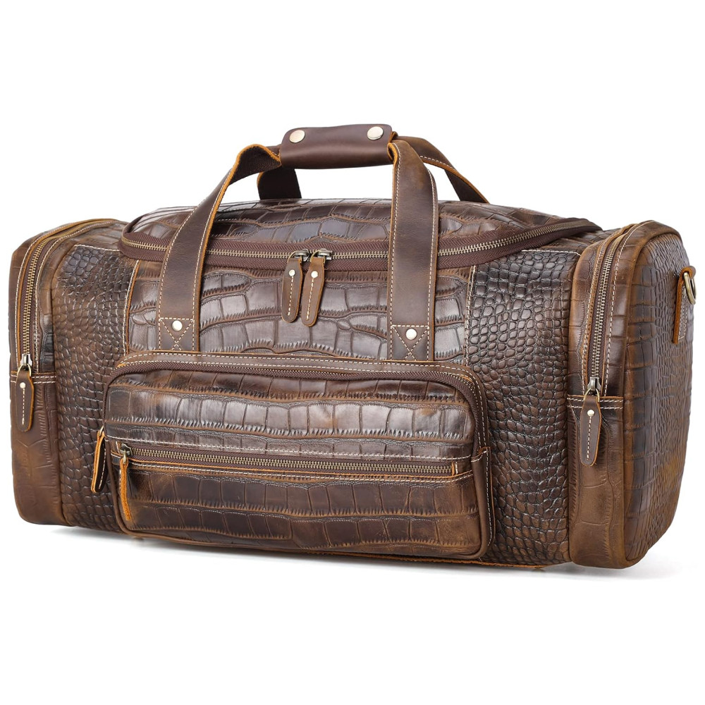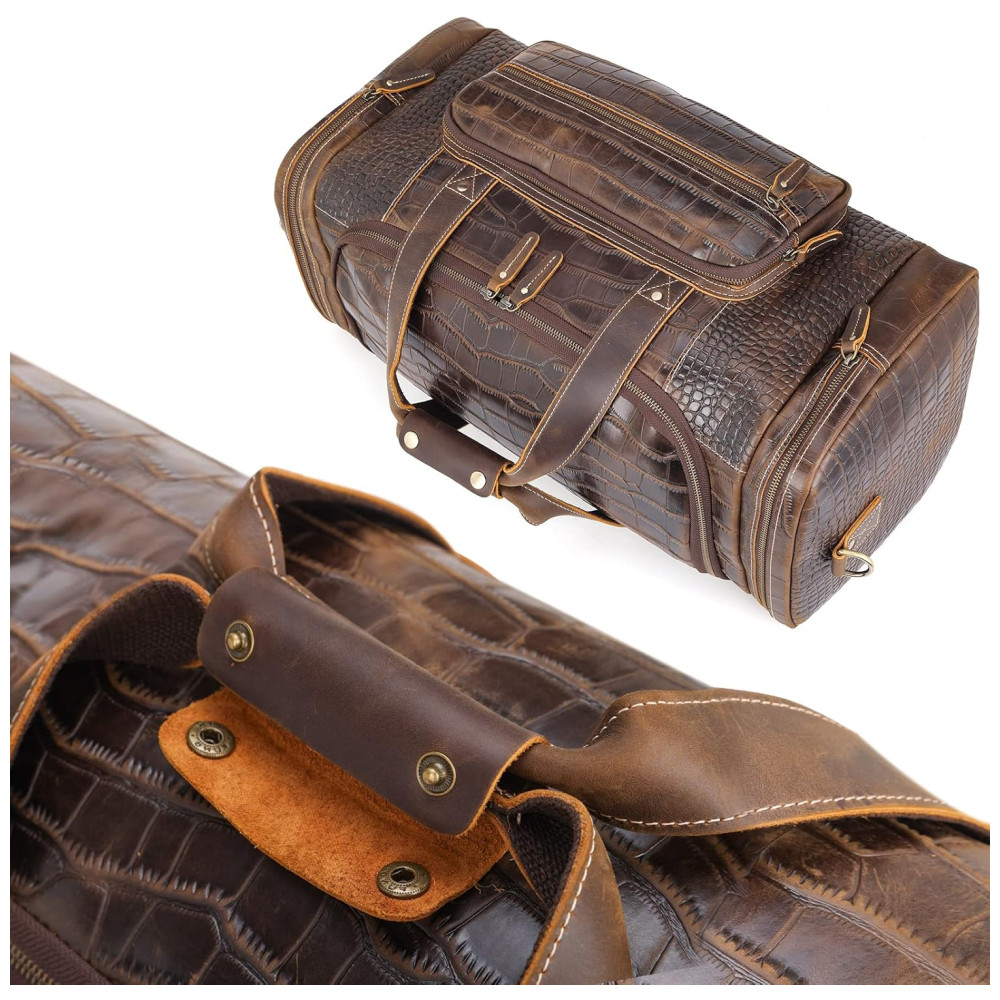 Couro de vaca com padrão de crocodilo 100 e zíperes de metal YKK Usamos couro americano autêntico que ganha personalidade à medida que envelhece e zíperes YKK premium para garantir qualidade e confiabilidade. Nossa Weekender Travel Duffel foi feita para enfrentar tudo o que você oferecer ao longo dos anos.