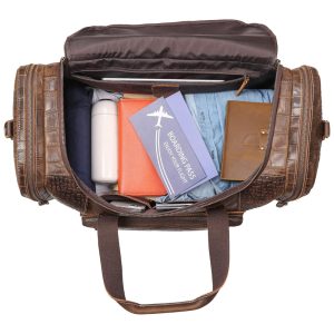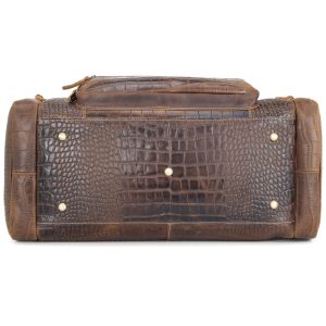 Couro de vaca com padrão de crocodilo 100 e zíperes de metal YKK Usamos couro americano autêntico que ganha personalidade à medida que envelhece e zíperes YKK premium para garantir qualidade e confiabilidade. Nossa Weekender Travel Duffel foi feita para enfrentar tudo o que você oferecer ao longo dos anos.