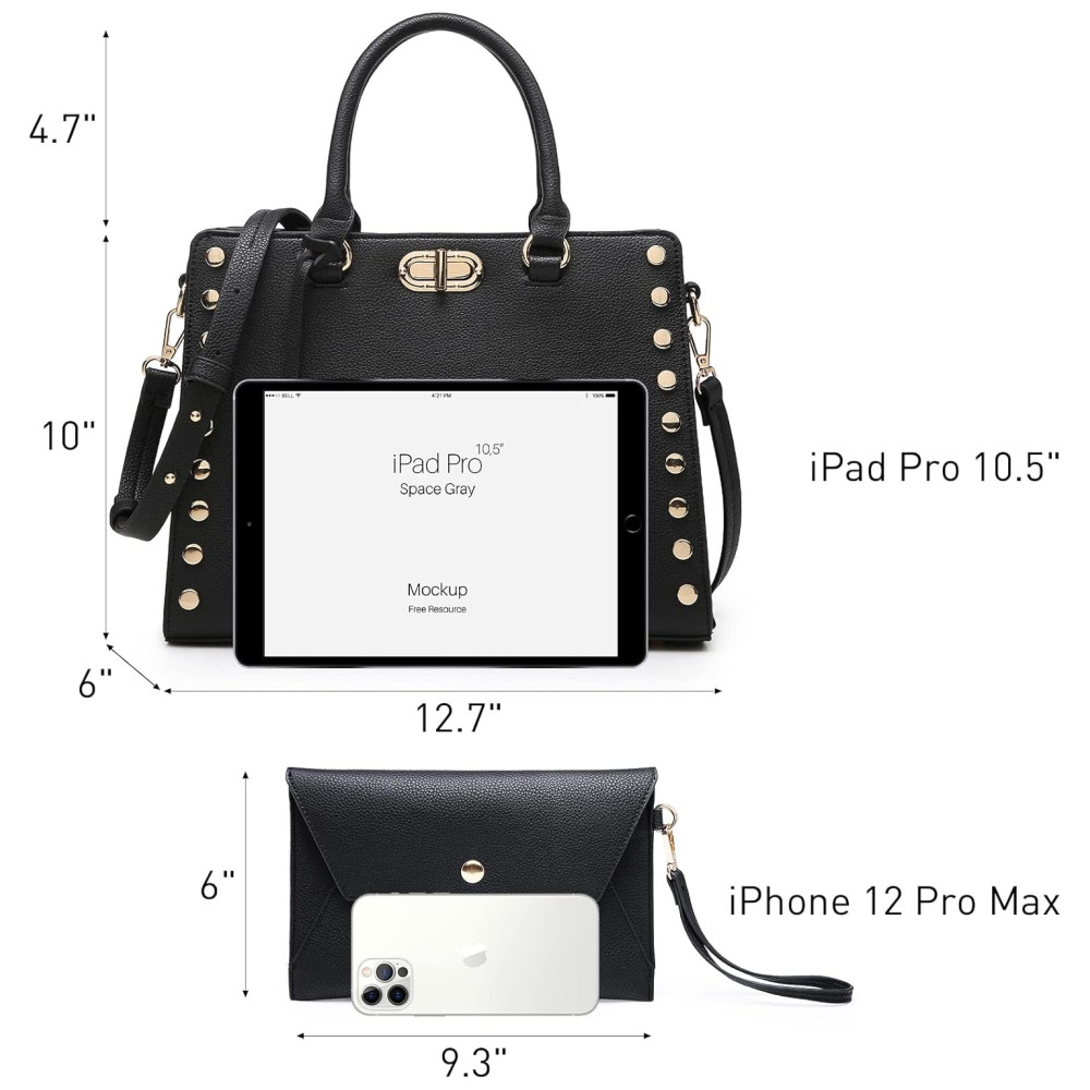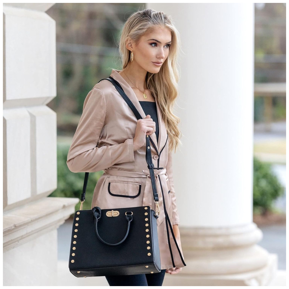 CARACTERÍSTICAS Design de moda com tachas laterais. Interior totalmente forrado. Fundo plano com tachas. Hardware em tom de ouro polido. Alça de ombro ajustável e removível. Alças confortáveis enroladas.