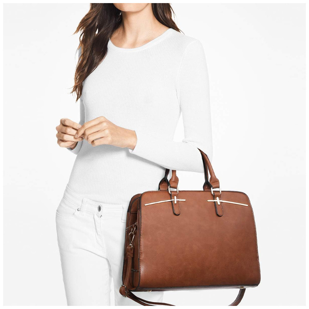 Design elegante Detalhado com hardware goldtone de alta qualidade, zíperes, tachas inferiores. As alças superiores em couro laminado são muito confortáveis para transportar e são especialmente reforçadas por uma decoração de metal durável.