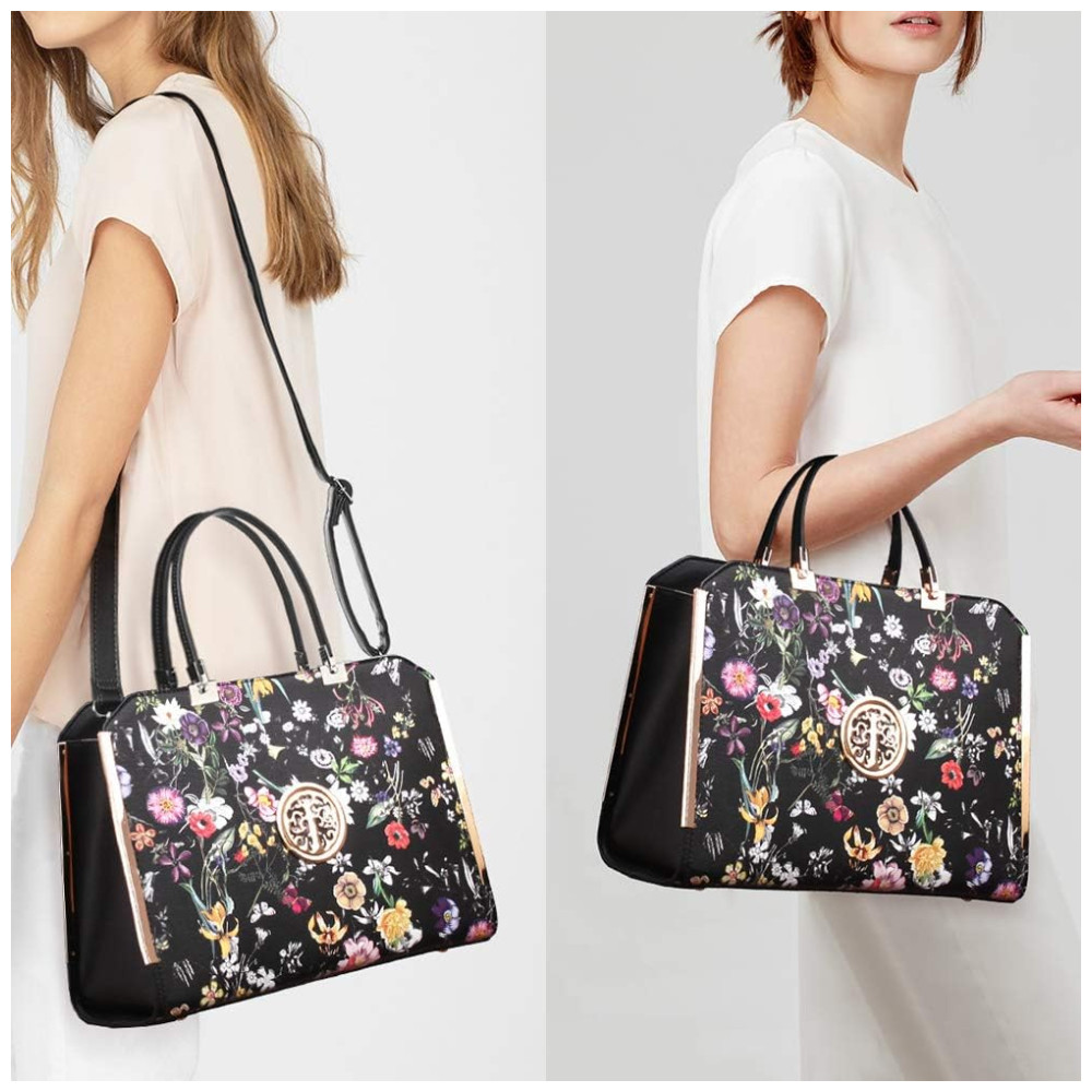 CARACTERÍSTICAS Design estruturado, pode manter sua forma o tempo todo. Fundo plano cravejado e hardware tom ouro. Fecho de correr superior. Alça superior em couro vegan e alça de ombro removível e ajustável. Estilo de cor única ou estilo de impressão de flores ou estilo listrado.