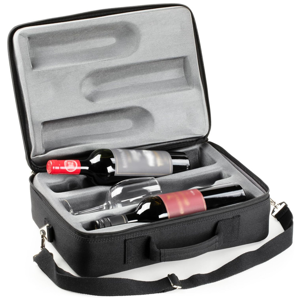 Ideal para transportar até 3 garrafas de vinho de 750 ml, bebida e/ou taças em viagens. As garrafas de vinho são GARANTIDAS INQUEBRÁVEIS quando a bolsa é derrubada de até 1,83 metros. Cabe na maioria dos espaços internos de malas para viagens de avião. Dimensões do produto: 40,64 cm x 30,48 cm x 12,7 cm. Alças laterais e alça de ombro ajustável/removível tornam fácil o transporte de garrafas de vinho, bebida e/ou taças para festas e jantares. A bolsa é isolada para ajudar a manter a temperatura desejada quando utilizada com bolsas de gelo (não incluídas).