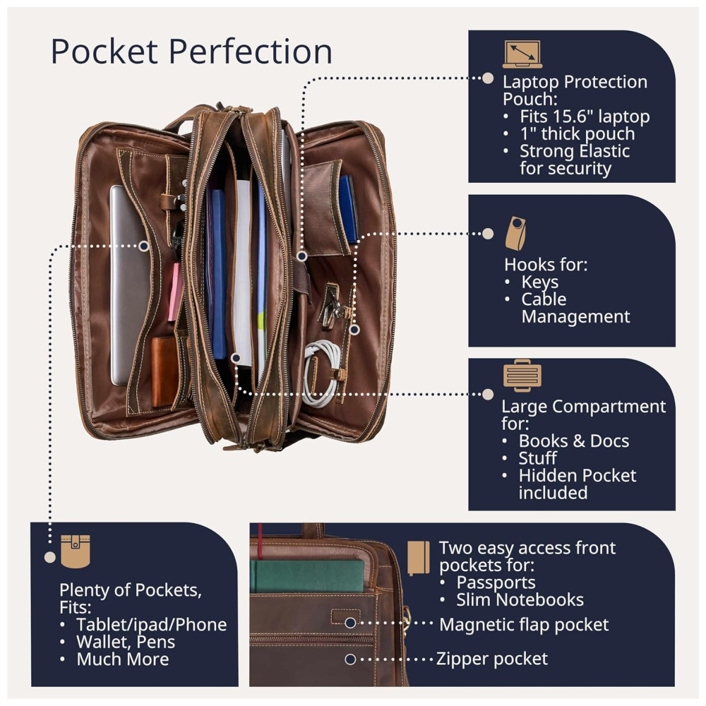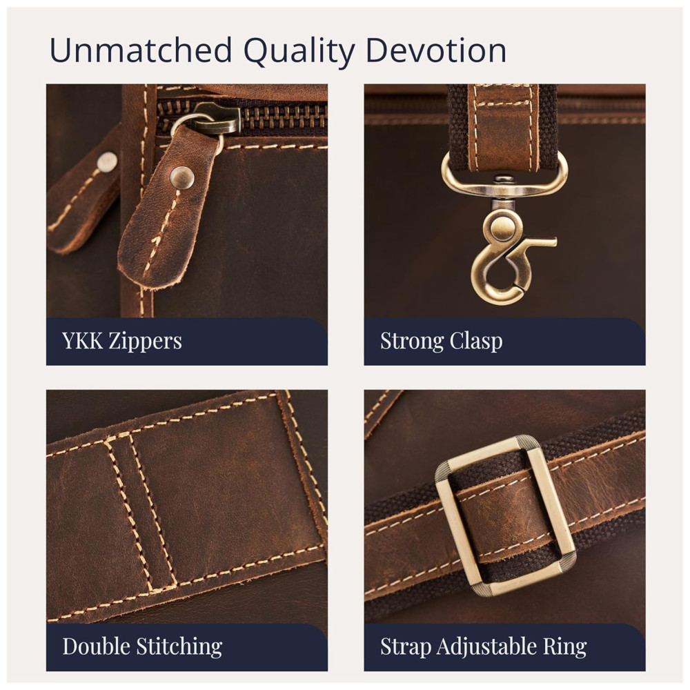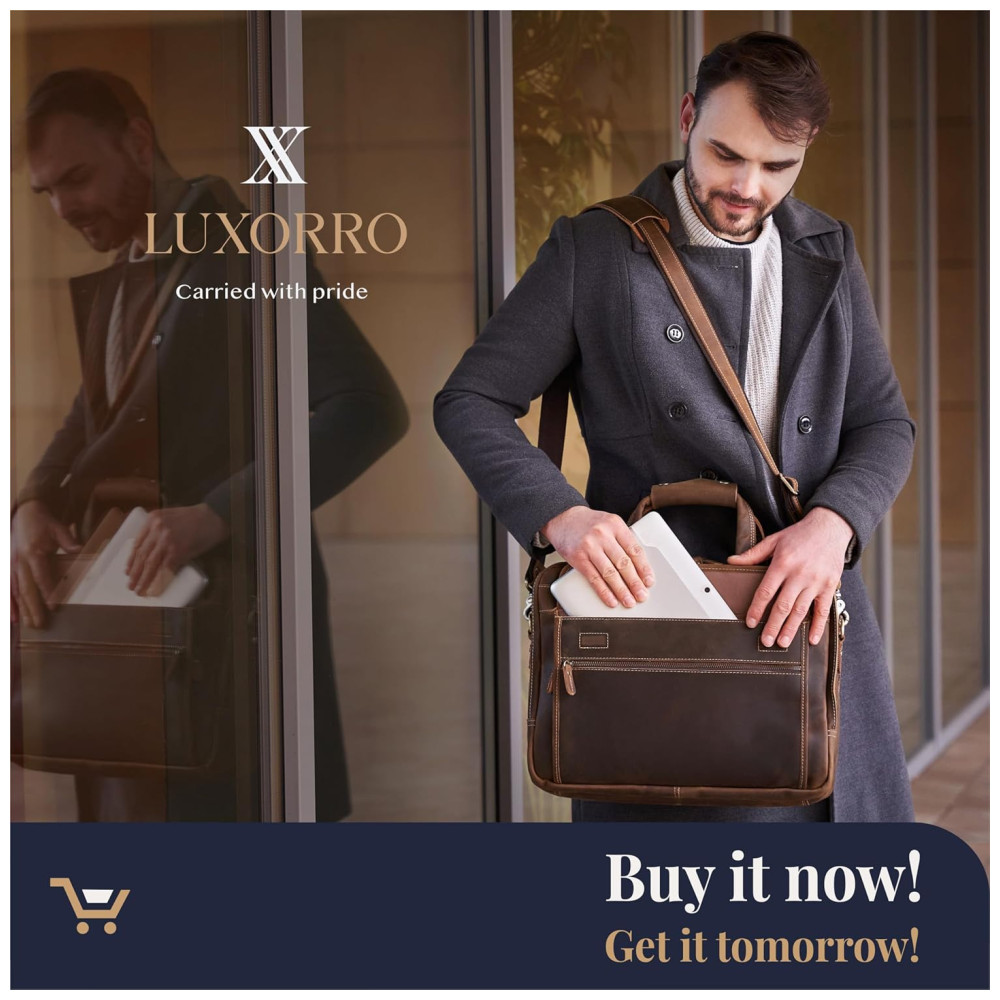 PASTA DE ALTA QUALIDADE PARA HOMENS QUE DURA UMA VIDA esta pasta de couro de alta qualidade de flor integral, com sua textura macia, zíperes YKK, alças fortes e linha com costura alta, vai durar a vida toda Não há necessidade de passar pelo processo frustrante de comprar uma nova sacola a cada poucos meses. Economize seu dinheiro e fique tranquilo com a alta qualidade do Luxorro. Qualquer conserto necessário Oferecemos garantia vitalícia