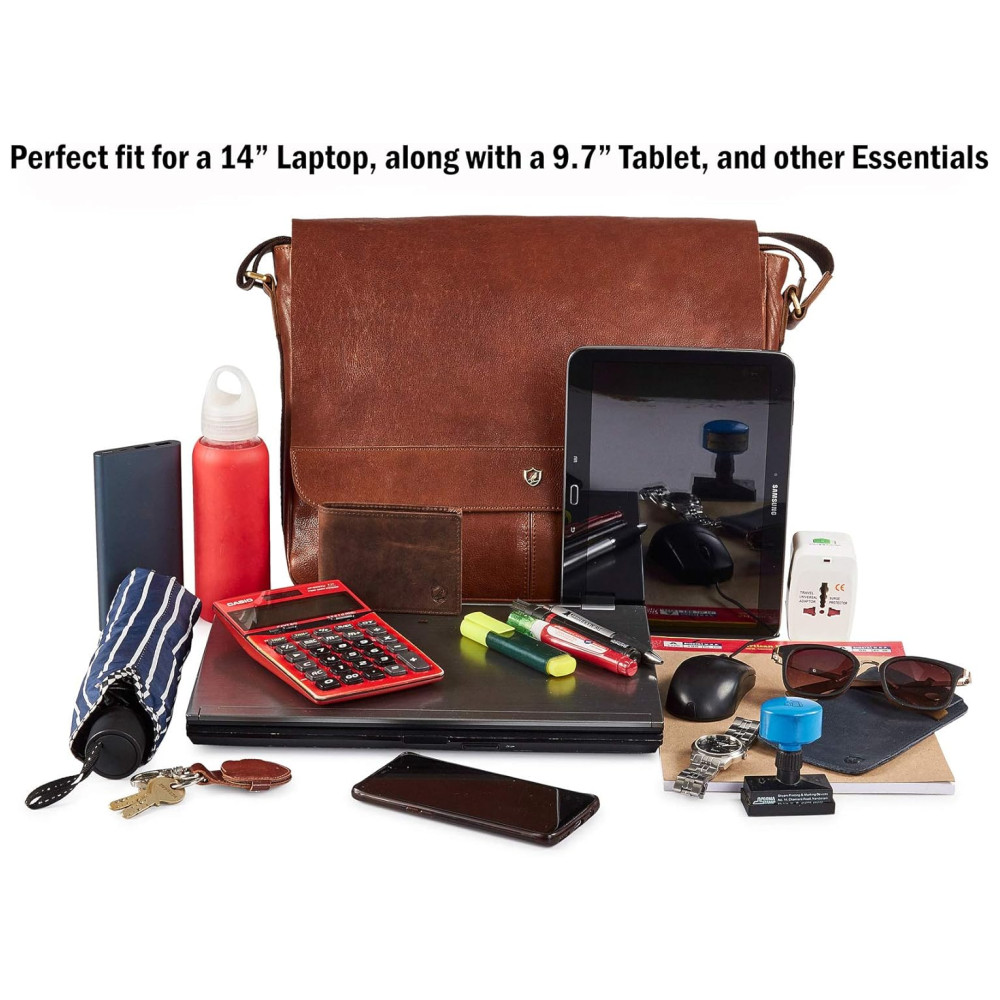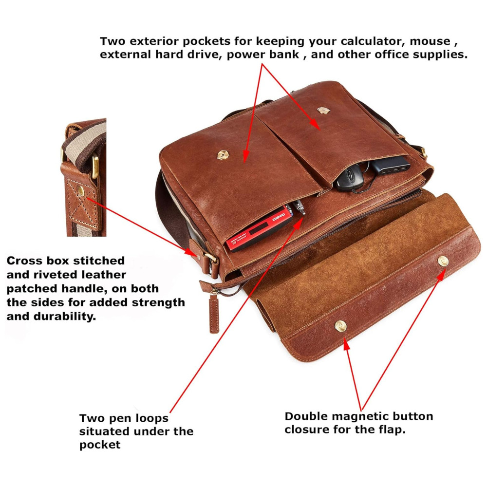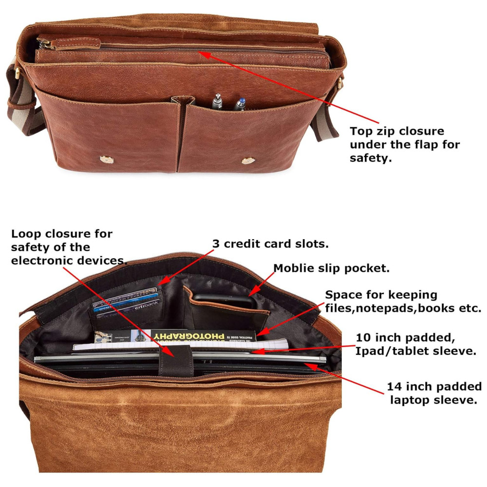 ALTO ZENAMENTO Nunca fique sem espaço com seu escritório, faculdade ou material escolar. Junto com um laptop de 14 e um tablet de 9,7 no bolso principal com zíper, você pode carregar um arquivo, caderno, garrafa de água, adaptador, banco de dados, alguns estacionários, calculadora, adaptador, óculos e etc. Possui 2 bolsos frontais sob a aba, para facilitar o acesso, um dos bolsos também possui 2 presilhas para caneta. Além disso, ele também possui bolsos de notas finos ou em alguns papéis soltos em trânsito.