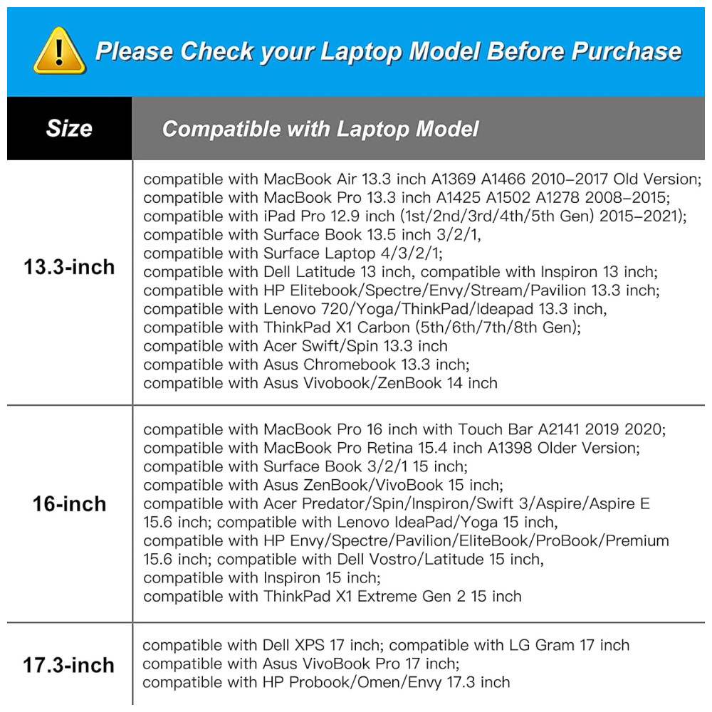 Feito de material de couro PU premium resistente à água, durável e moderno. Design profissional para proteger eficazmente o seu laptop contra impactos e arranhões acidentais. Bastante espaçoso com 3 compartimentos para todas as suas coisas diárias. O maior compartimento no meio para guardar seu laptop e outras coisas importantes, os outros dois compartimentos laterais para banco de energia, telefone celular, livro, chaves, mouse, passaportes, cartões de crédito, dinheiro, maquiagens e assim por diante. Mantenha seus itens bem organizados.