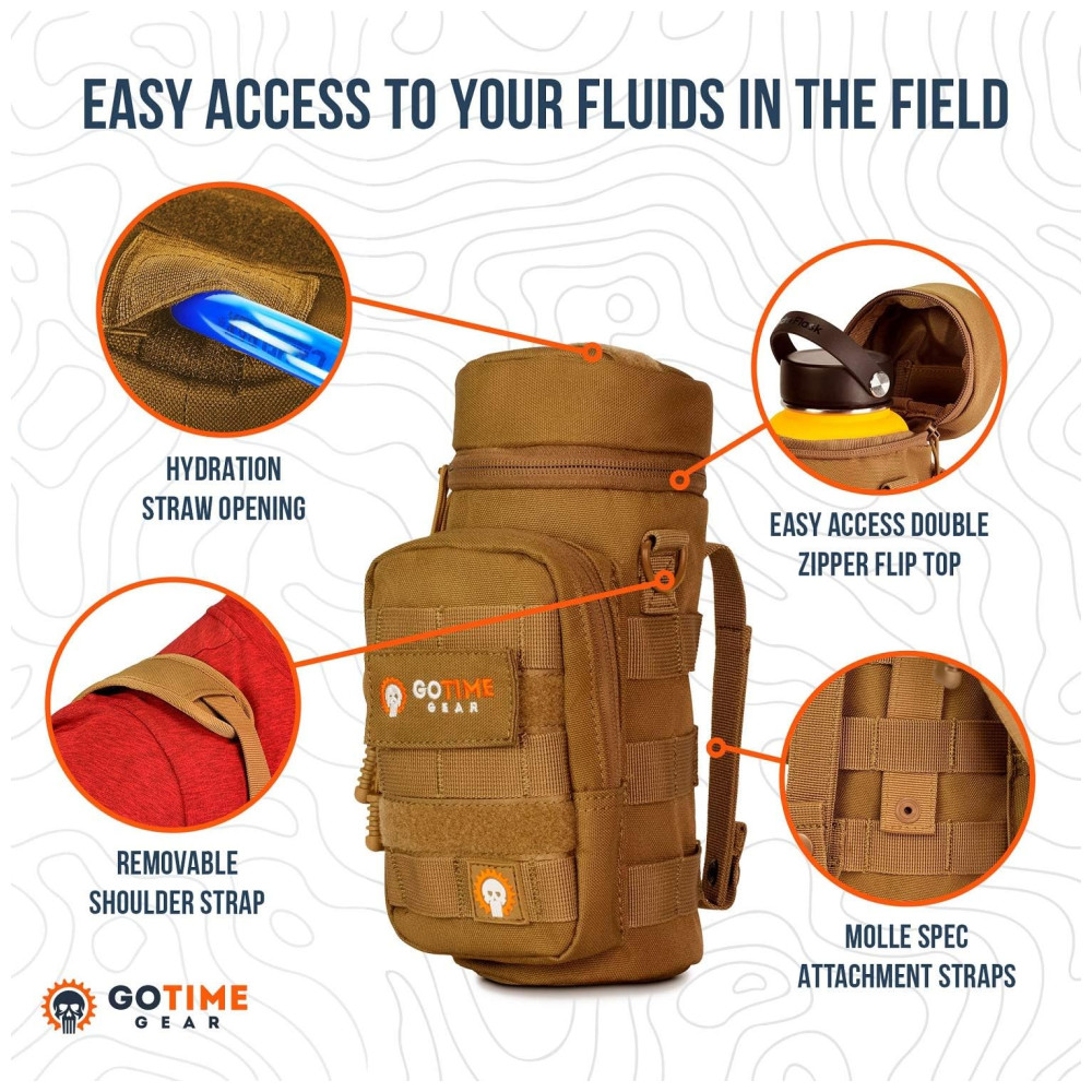 Material resistente e componentes resistentes e duráveis feito de poliéster 600D com suporte de PVC espesso, resistente às intempéries e à água, sua bolsa para garrafa de água MOLLE resiste ao desgaste nas situações mais difíceis, proporcionando segurança e isolamento para seus líquidos ou equipamentos. Zíperes e fechos de zíper YKK resistentes à ferrugem e à água de alta qualidade, os puxadores de zíper paracord não se desgastam ou se soltam, alça de ombro removível e costura reforçada garantem que seu equipamento esteja e protegido