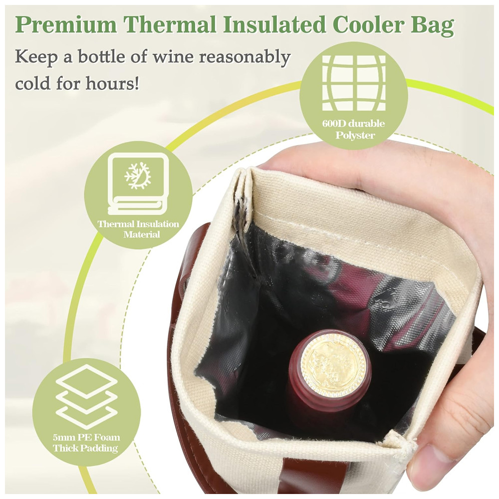 A Bolsa Térmica para Garrafa de Vinho Tirrinia foi projetada para oferecer máxima portabilidade, com alça resistente que facilita seu transporte. Seja para uma festa, jantar, restaurante, piquenique, praia, concerto ou evento esportivo, esta bolsa garante que sua bebida favorita viaje com estilo. Além de carregar vinho, também serve como bolsa térmica para água, cerveja e refrigerantes, sendo essencial em qualquer ocasião. Com isolamento térmico, mantém seu vinho gelado por horas, preservando seu sabor e protegendo a garrafa de impactos. Um presente ideal para amantes de vinho, com design elegante em lona e alça de couro sintético.