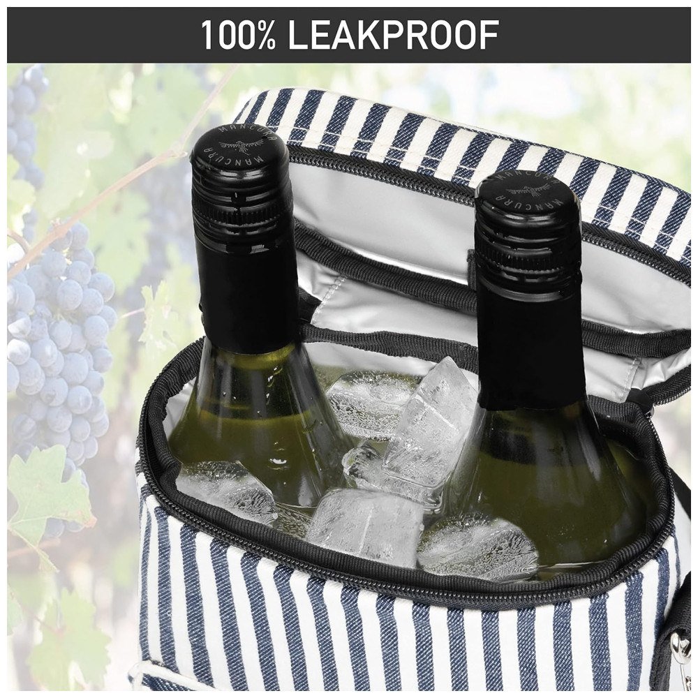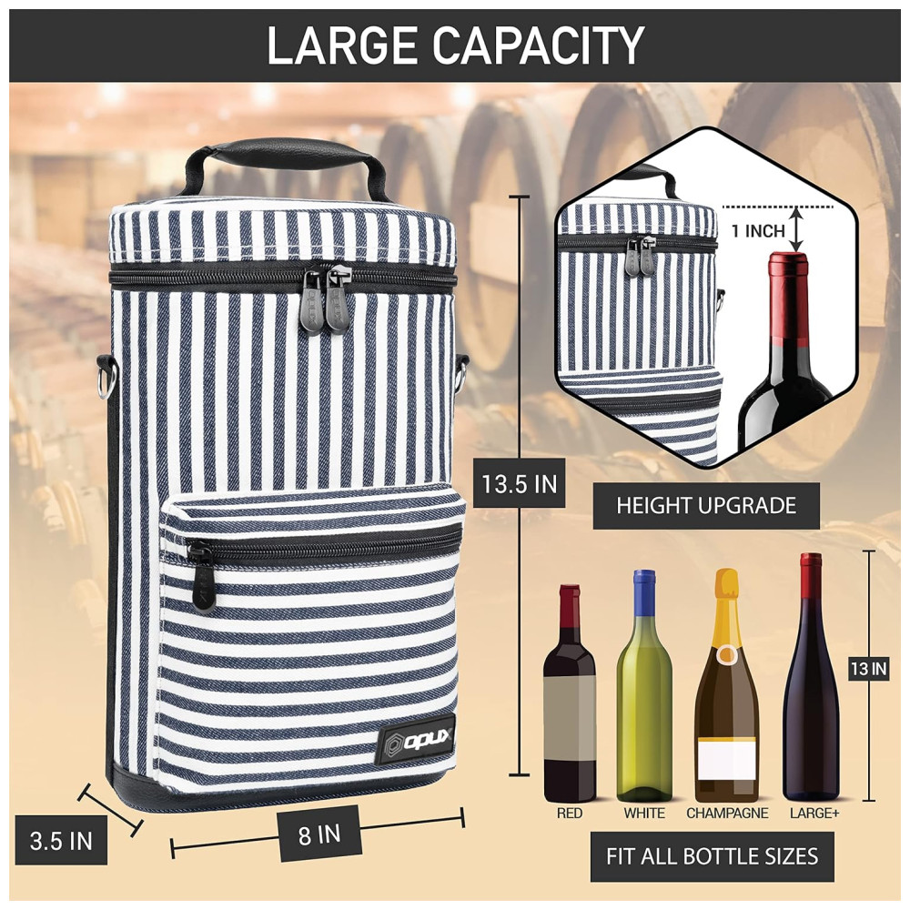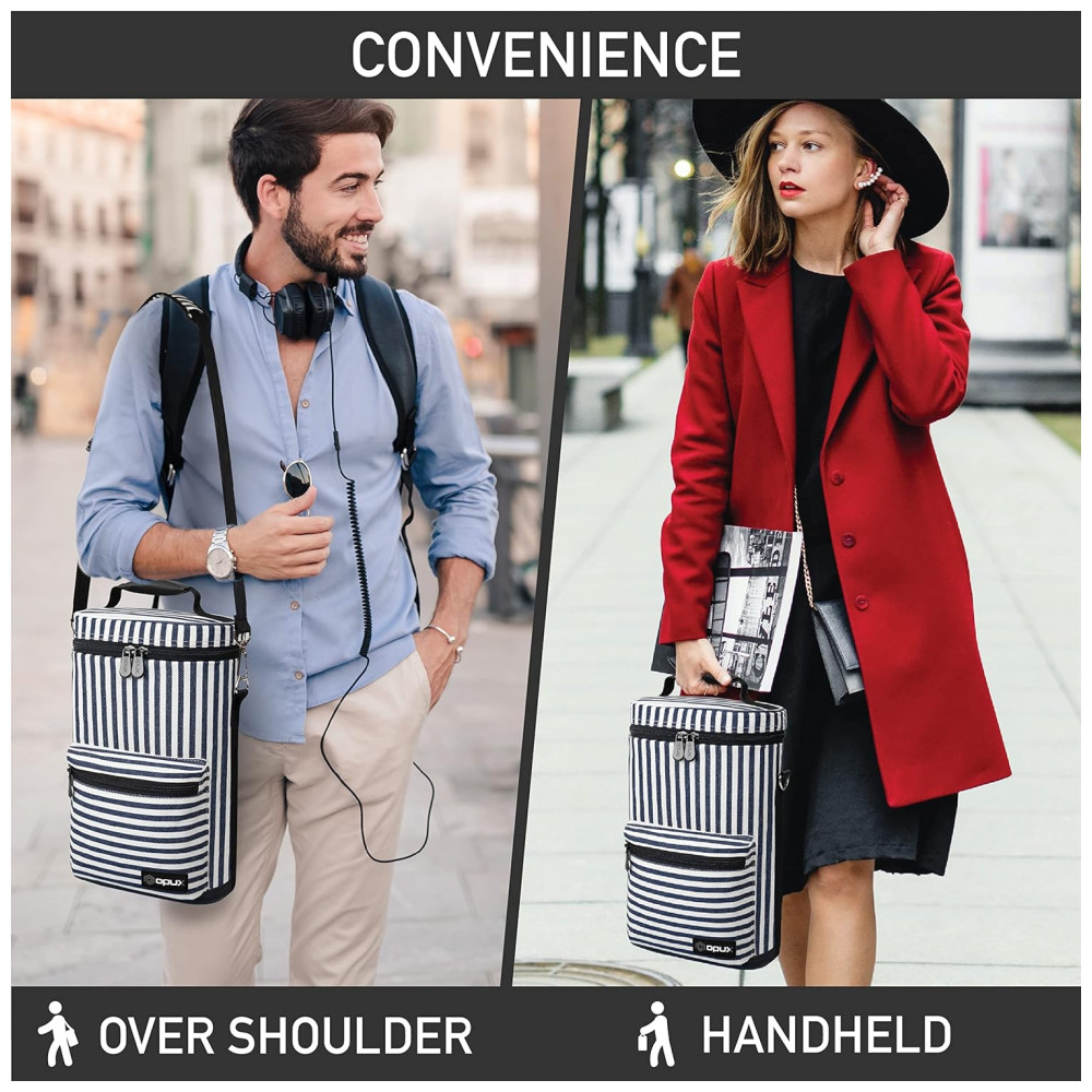 ESTILISTA E DURÁVEL Fabricado em poliéster 600D de alta qualidade para garantir a máxima durabilidade e aba e parte inferior em couro PU para um toque de elegância. Esta bolsa de transporte de garrafas é clássica, mas elegante. Faz um grande presente de aniversário ou presente do dia dos pais.
