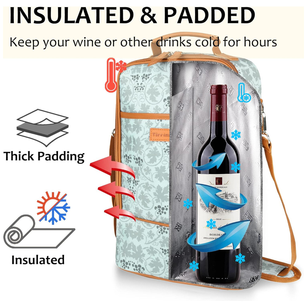 ISOLADO TÉRMICO Material com isolamento térmico de PU e enchimento de espuma PE de 5mm protegem suas garrafas de vinho de colisões externas, mantenha 2 garrafas de vinho intactas e bem refrigeradas por horas.