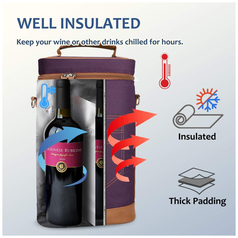 TECIDO ISOLADO E ACOLCHOADO Material com isolamento térmico de PU e enchimento de espuma PE de 5mm protegem suas garrafas de vinho de colisões externas, mantenha 2 garrafas de vinho intactas e bem refrigeradas por horas.
