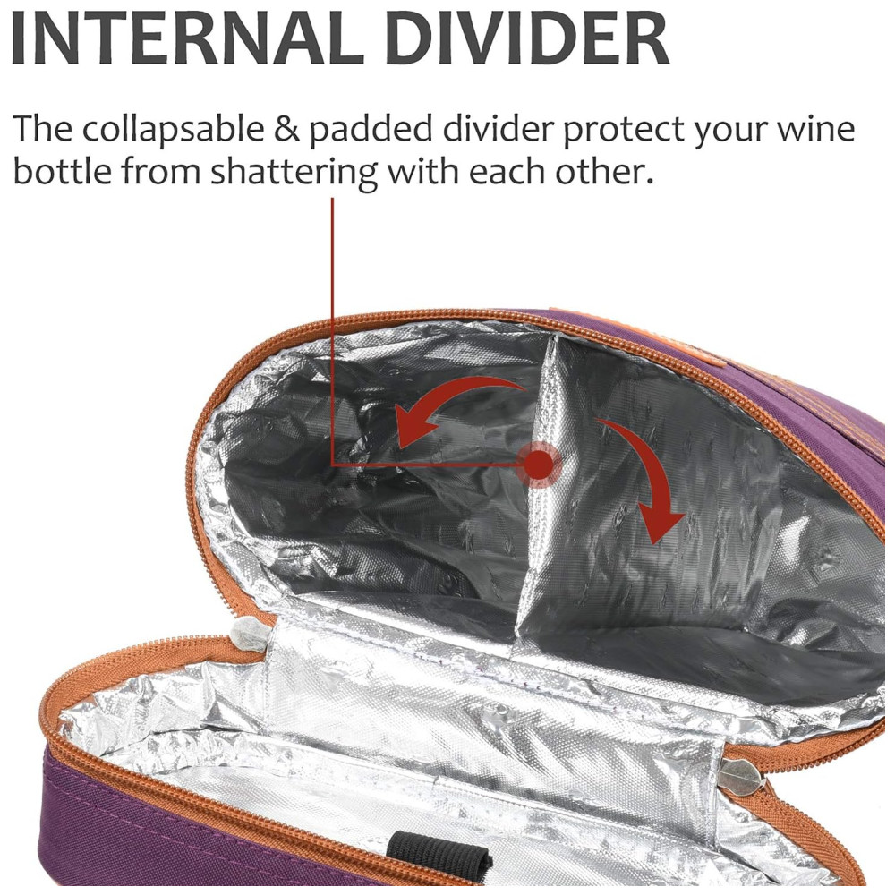 PROTEJA SUA GARRAFA DE VINHO DE QUEBRAR A divisória interna acolchoada mantém 2 garrafas de vinho separadas e evita que elas batam umas nas outras. Também é dobrável, você pode usar a bolsa de vinho como uma bolsa térmica isolada para transportar água, bebida ou cerveja.