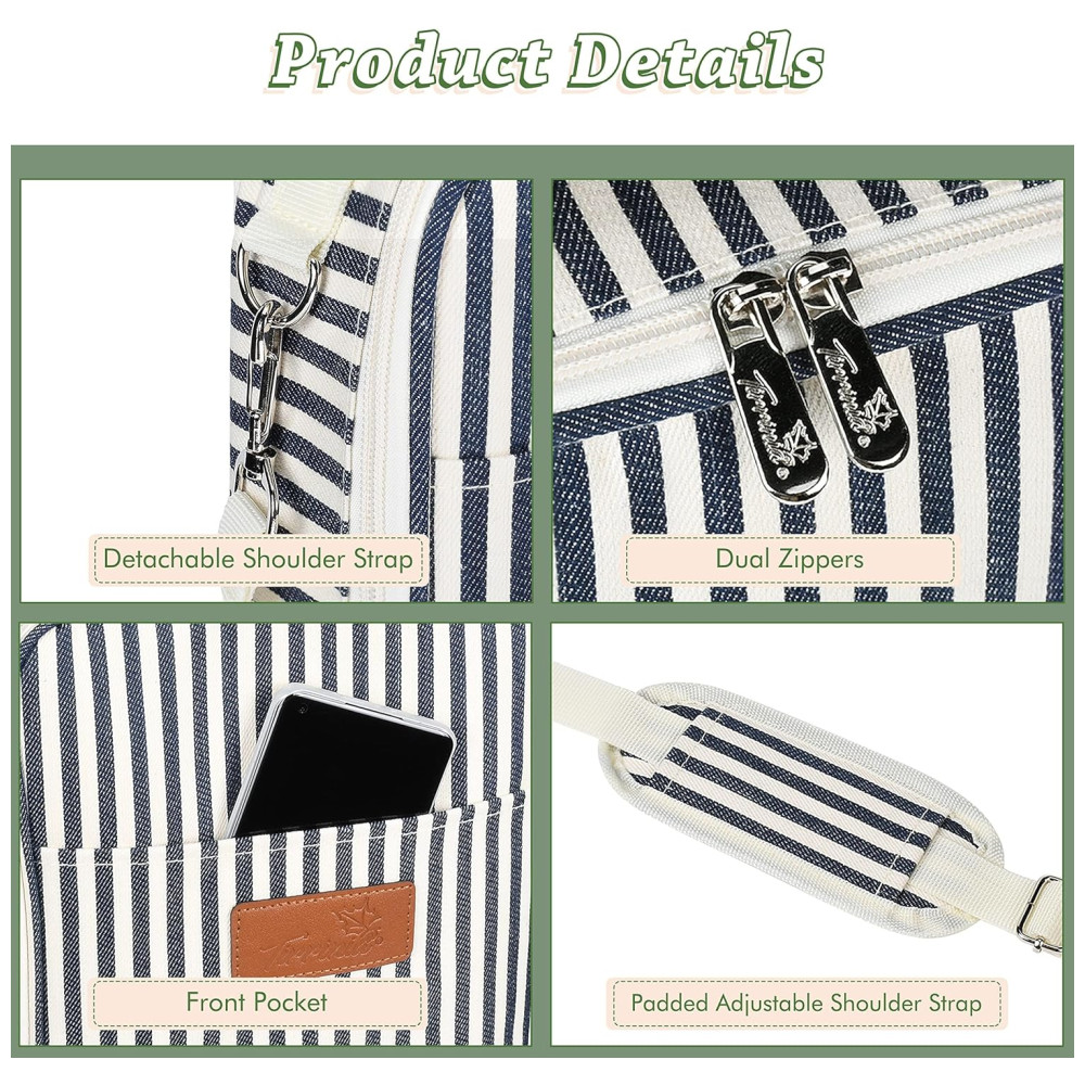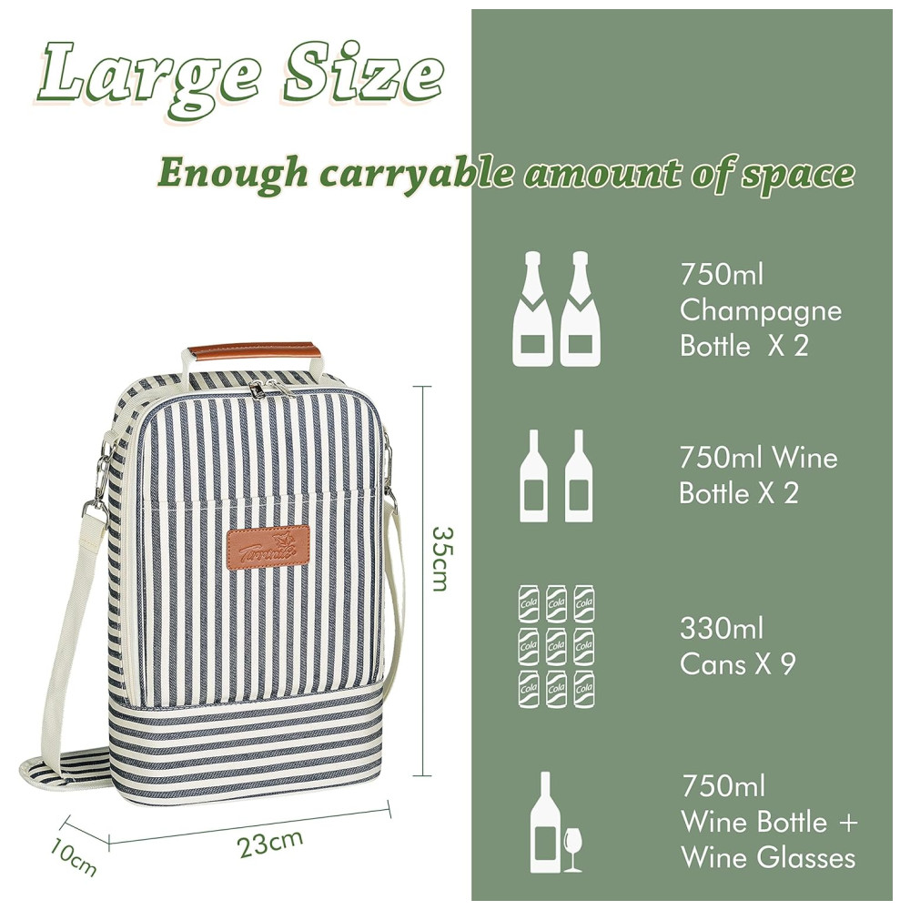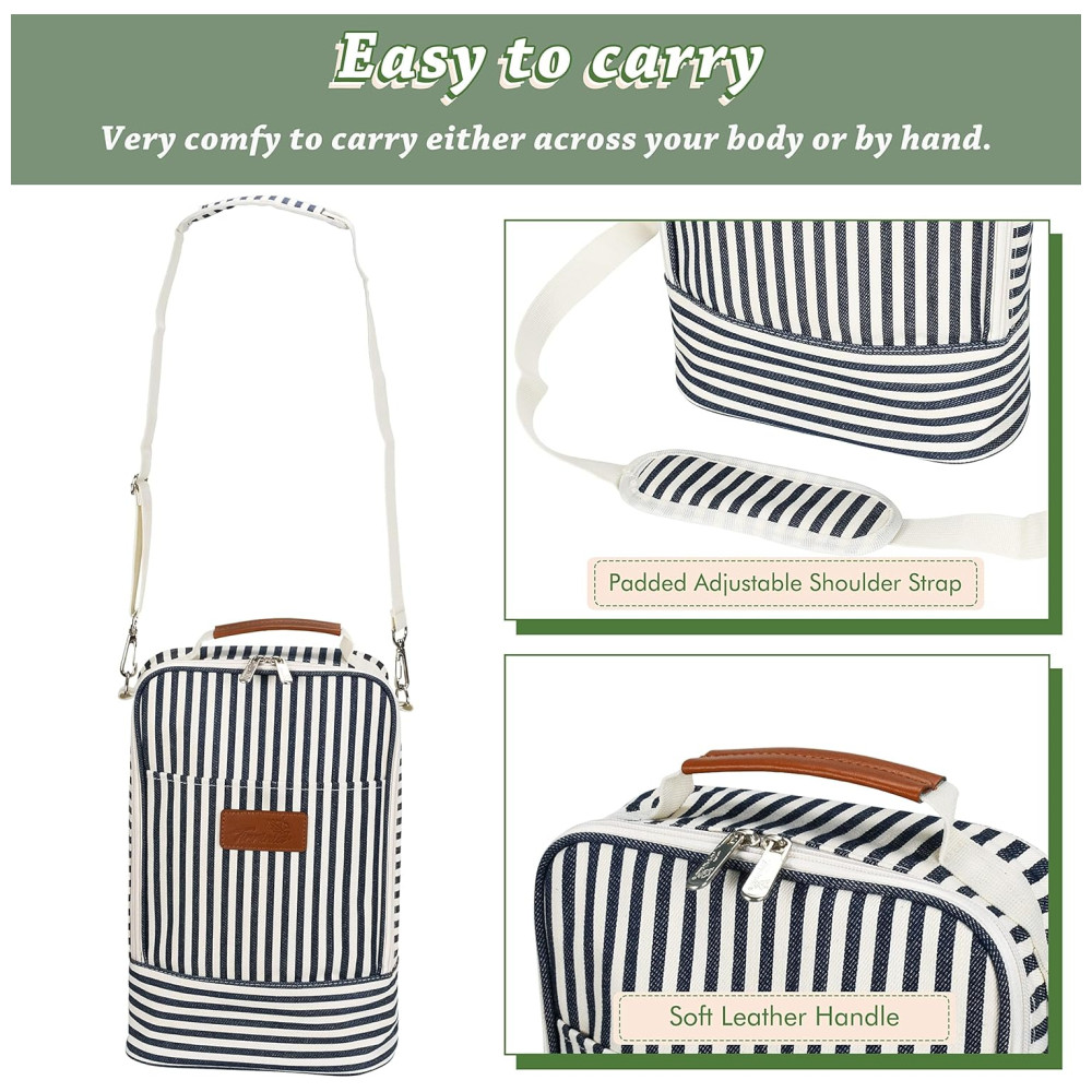 Alça resistente e alça de ombro ajustável com fivela de aço inoxidável deste porta vinhos ajudam você a transportar seu vinho para qualquer lugar. Esta sacola de transporte de vinho tem amplo espaço para 2 garrafas de vinho de tamanho normal 21 x 9 x . Também pode ser dobrada e embalada facilmente.