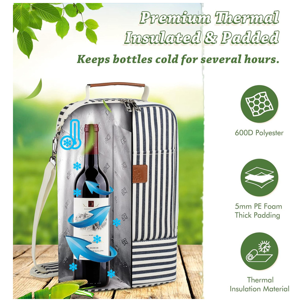 ACOLCHOADO E ISOLADO TÉRMICO Material com isolamento térmico de PU e enchimento de espuma PE de 5mm protegem suas garrafas de vinho de colisões externas, mantenha 2 garrafas de vinho intactas e bem refrigeradas por horas.