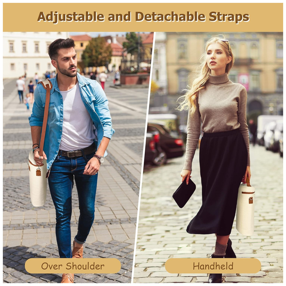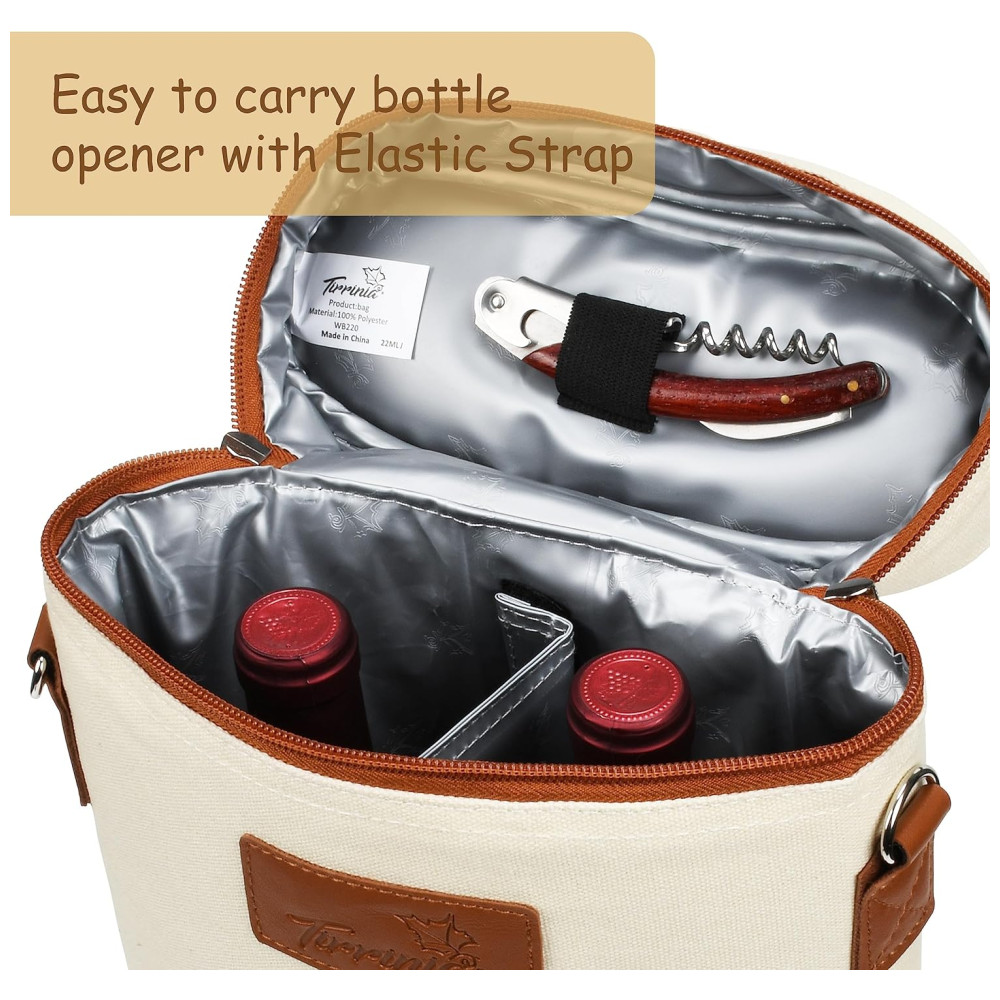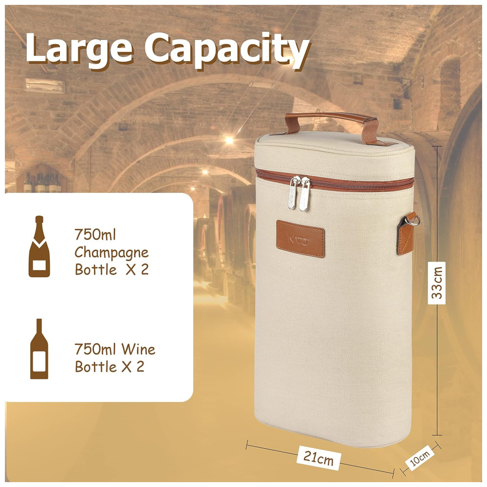 Alça resistente e alça de ombro ajustável com fivela de aço inoxidável deste porta vinhos ajudam você a transportar seu vinho para qualquer lugar. A sacola de transporte de vinho Tirrinia tem amplo espaço para 2 garrafas de vinho de tamanho normal 21 x 9 x . Também pode ser dobrada e embalada facilmente.