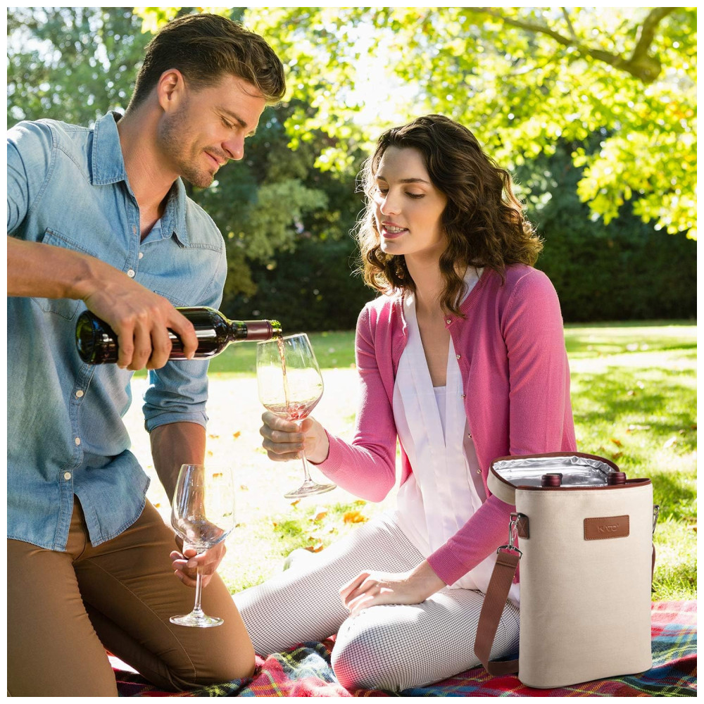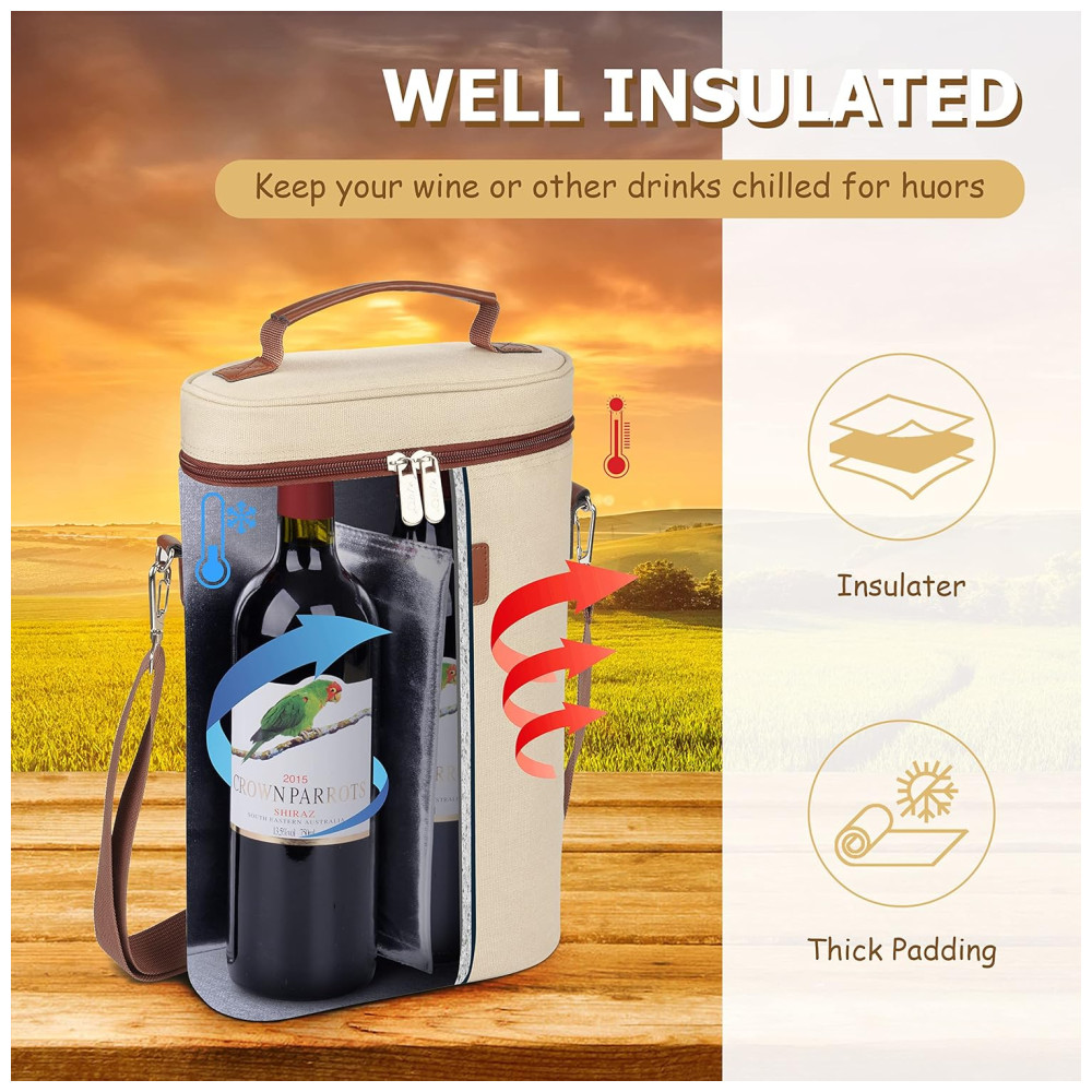 ACOLCHOADO E ISOLADO TÉRMICO Material com isolamento térmico de PU e enchimento de espuma PE de 5mm protegem suas garrafas de vinho de colisões externas, mantenha 2 garrafas de vinho intactas e bem refrigeradas por horas
