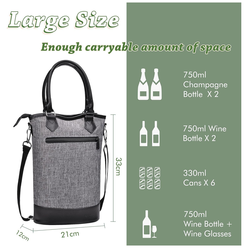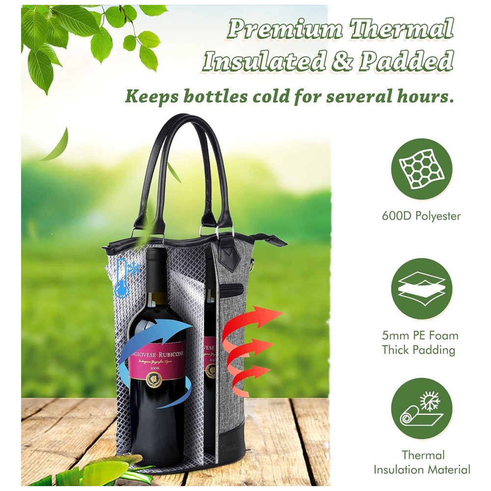ACOLCHOADO E ISOLADO TÉRMICO O material composto de folha de alumínio com isolamento térmico e o enchimento de espuma PE de protegem suas garrafas de vinho de colisões externas, mantenha 2 garrafas de vinho , champanhe intactas e bem refrigeradas por horas