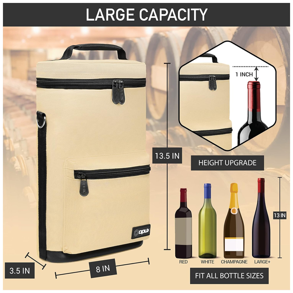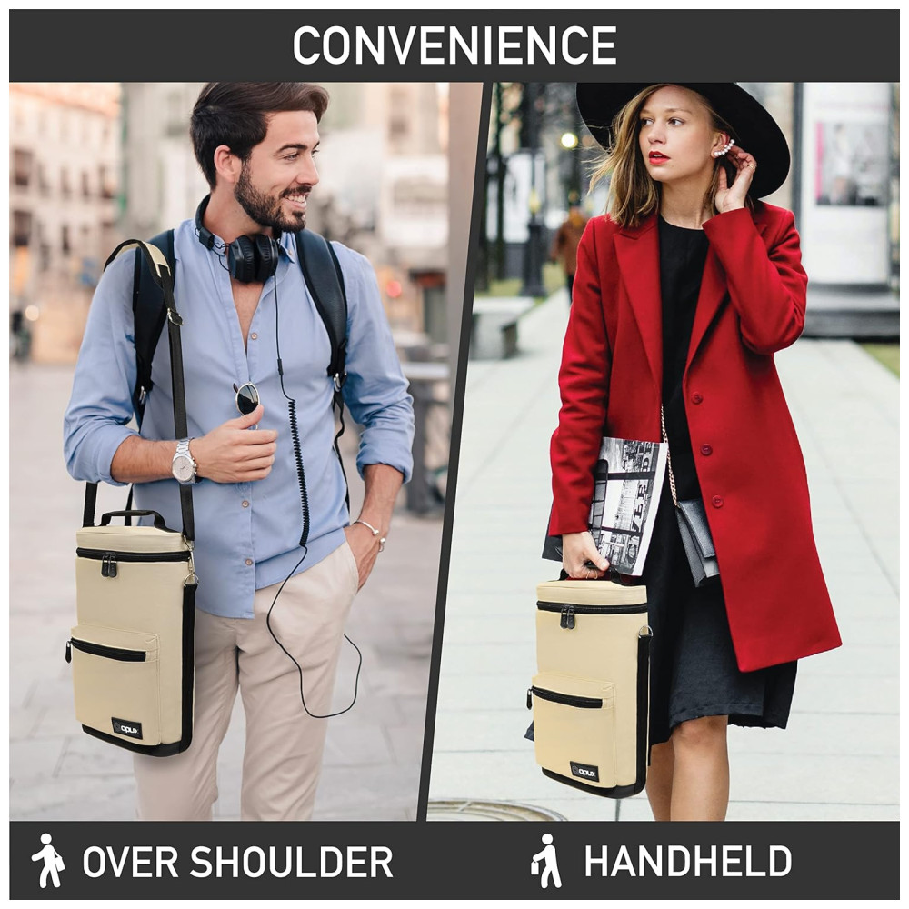 ESTILISTA E DURÁVEL Fabricado em poliéster 600D de alta qualidade para garantir a máxima durabilidade e aba e parte inferior em couro PU para um toque de elegância. Esta bolsa de transporte de garrafas é clássica, mas elegante. Faz um grande presente de aniversário ou presente do dia dos pais.
