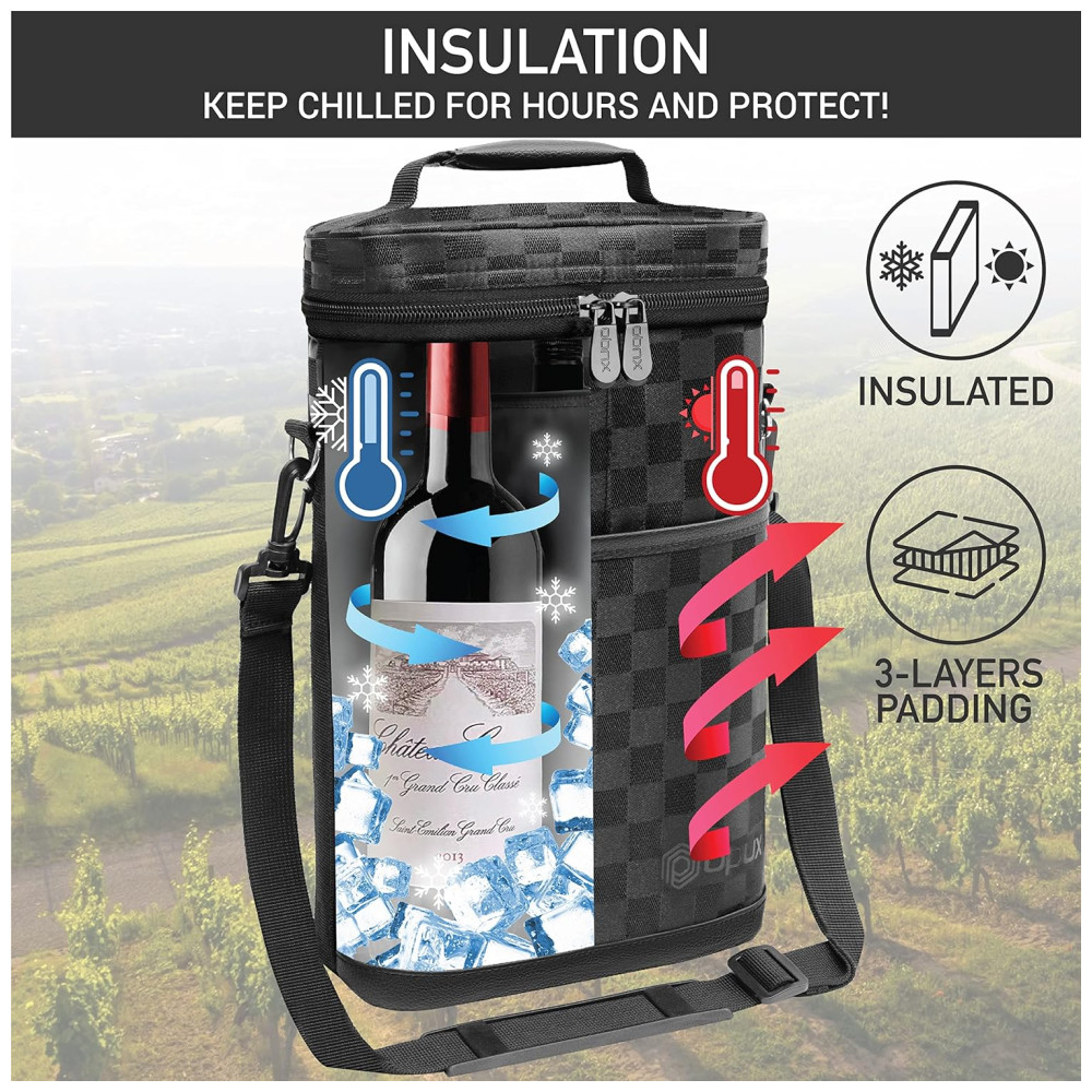 PROTEÇÃO E CONTROLE DE TEMPERATURA DA GARRAFA DE VINHO Forro acolchoado para proteger as garrafas de quebrar durante a viagem, enquanto seu material de isolamento térmico mantém a temperatura do seu vinho estável se ele estiver frio ou em temperatura ambiente