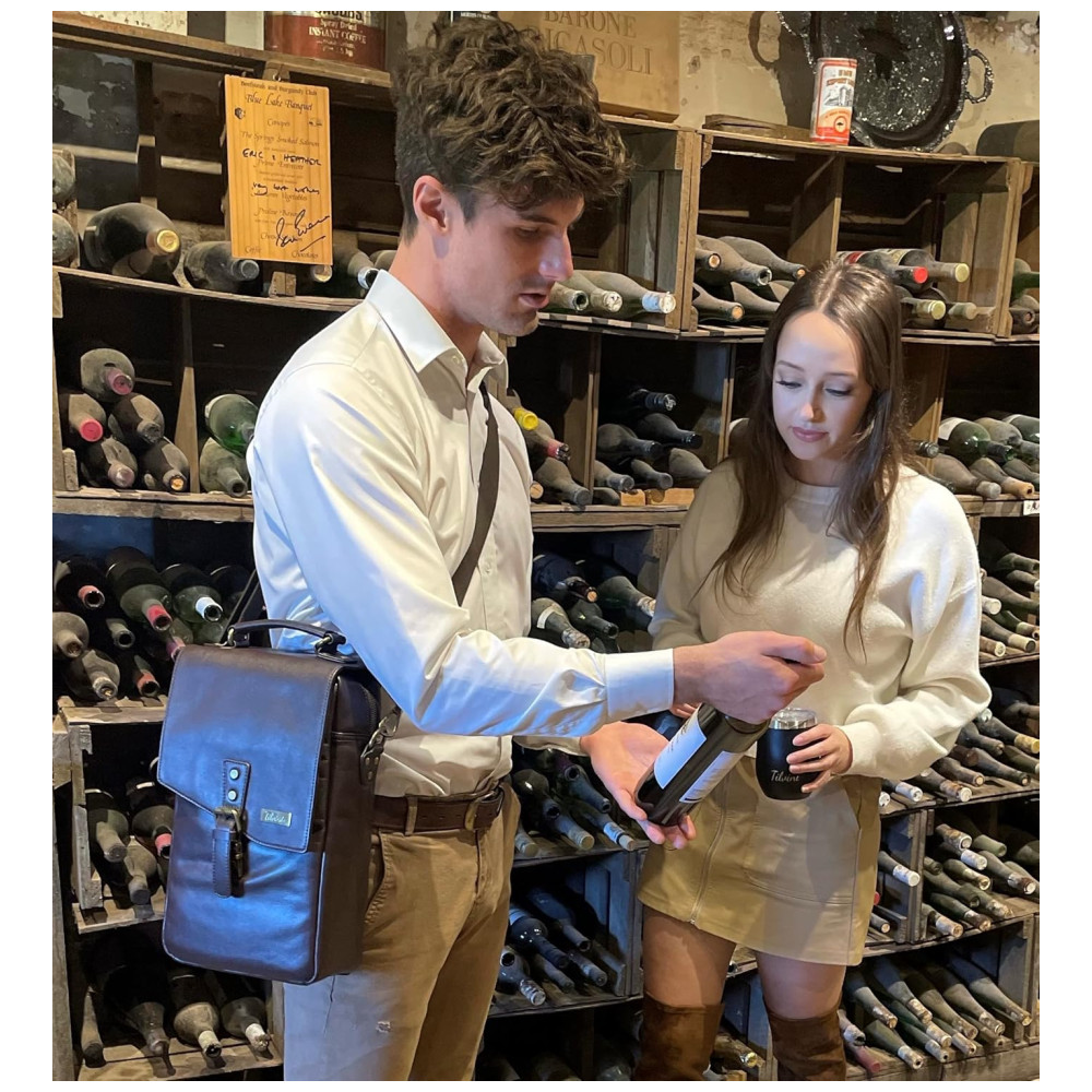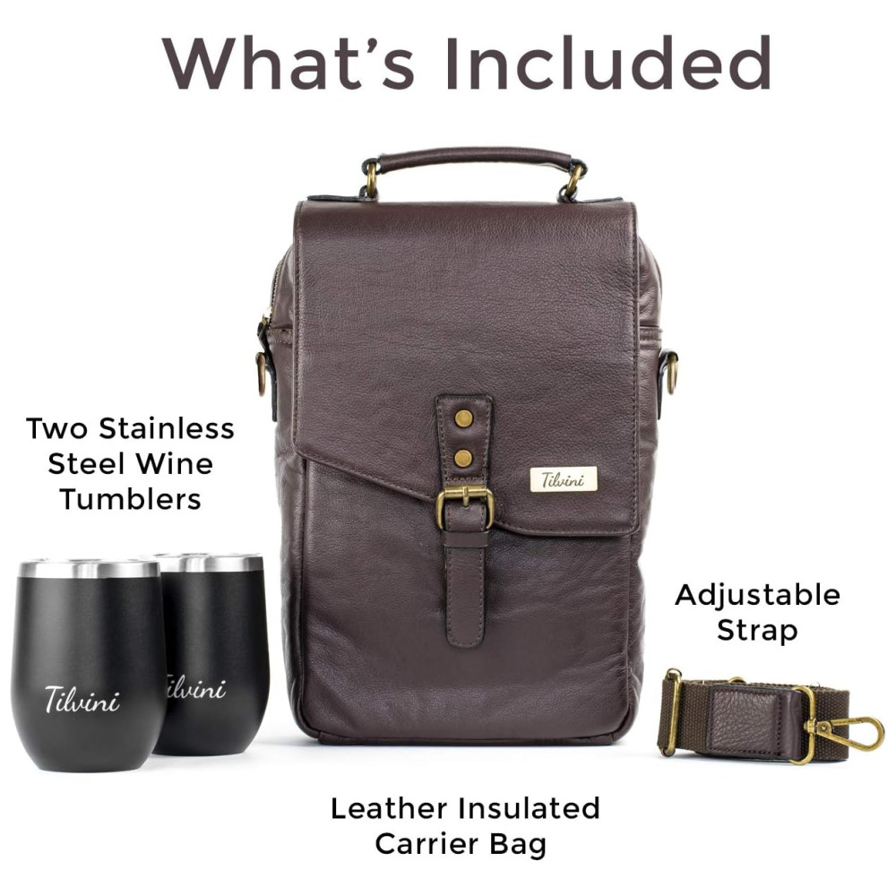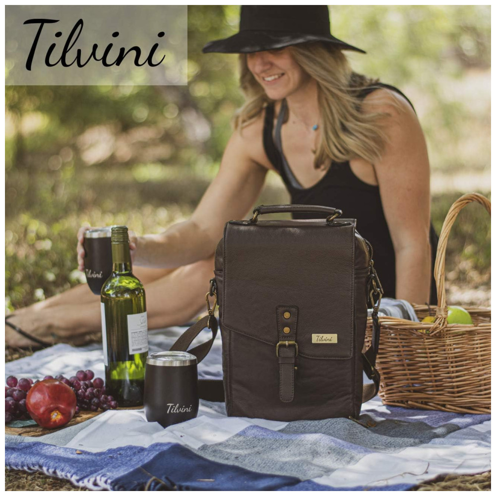 LEVE SEU VINHO PARA QUALQUER LUGAR com esta bolsa de couro para garrafas de vinho e 2 copos de vinho de aço inoxidável Esta sacola de couro para vinho é diferente de todas as outras não só a sacola de vinho elegante e isolada tornará seu vinho facilmente transportável, mas também o manterá fresco nas temperaturas mais quentes. A bolsa de vinho Tilvini é um acessório de viagem premium e esses porta vinhos de couro são os melhores presentes de vinho para homens ou mulheres. Obtenha seu conjunto de bolsa de couro para vinho da Tilvini hoje mesmo