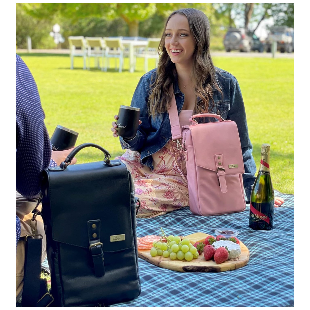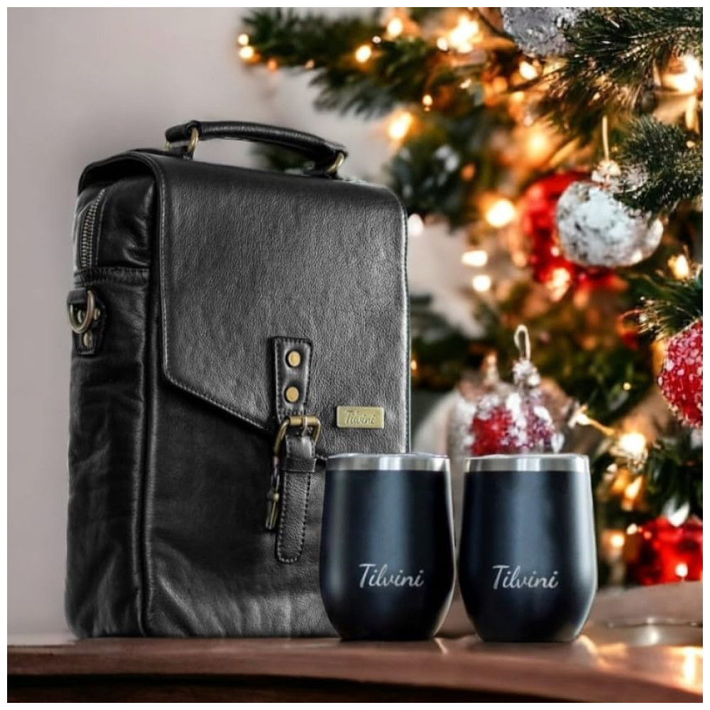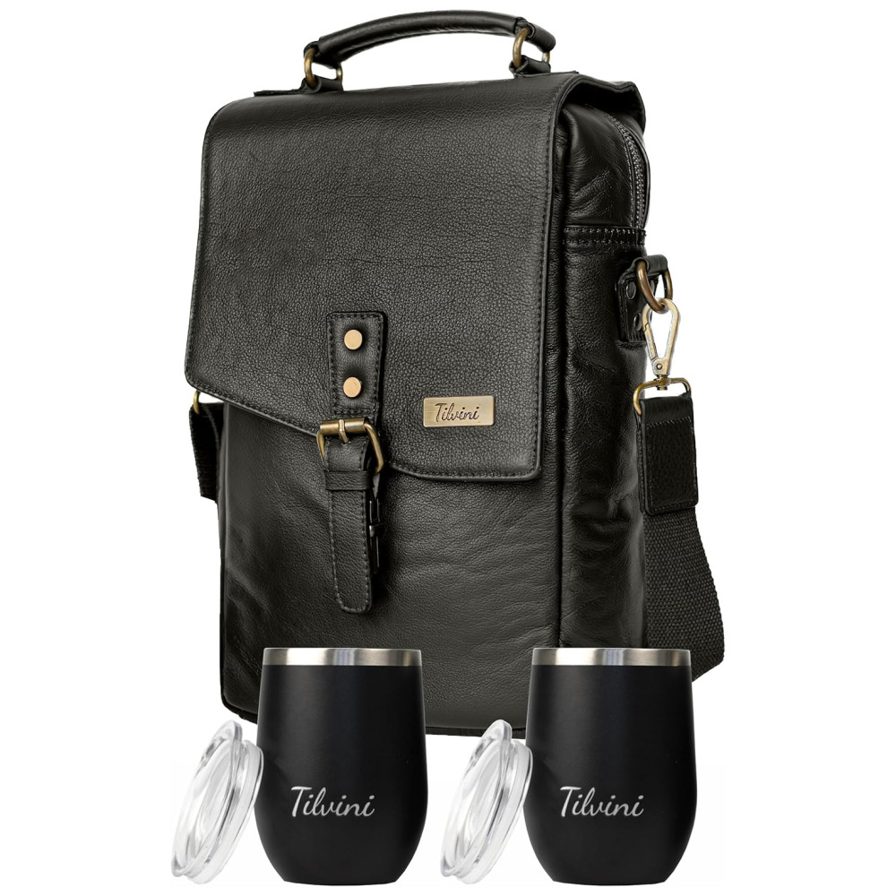 Bolsa Térmica Para Transporte de Vinhos de Couro até 2 Garrafas com 2 Copos Incluídos TILVINI TV 01 Preto