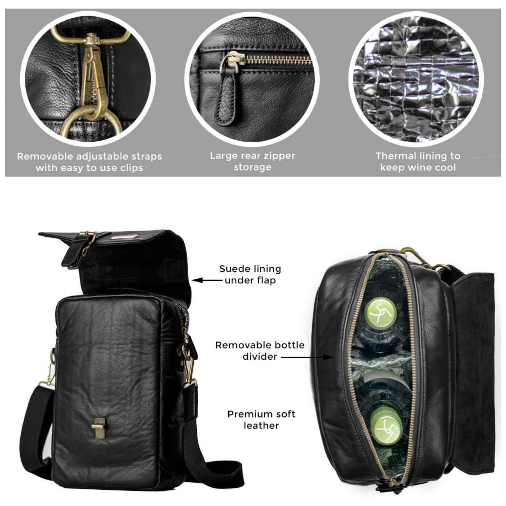 ESTILO E FUNCIONALIDADE COMBINADOS com a nossa bolsa térmica para garrafas de vinho em couro . O divisor de garrafa ajustável para fácil posicionamento, grande bolso de zenamento na parte traseira da sacola para arrumar seus acessórios de vinho, bolsa de garrafa de vinho isolada para manter o vinho fresco e alça de ombro ajustável para caber perfeitamente em você, torna esta a caixa de vinho perfeita para amantes de vinho como tu. A caixa de vinho Tilvini agora vem com não 1 copo de vinho de aço inoxidável de bônus, mas 2 Presentes legal para mulheres e homens