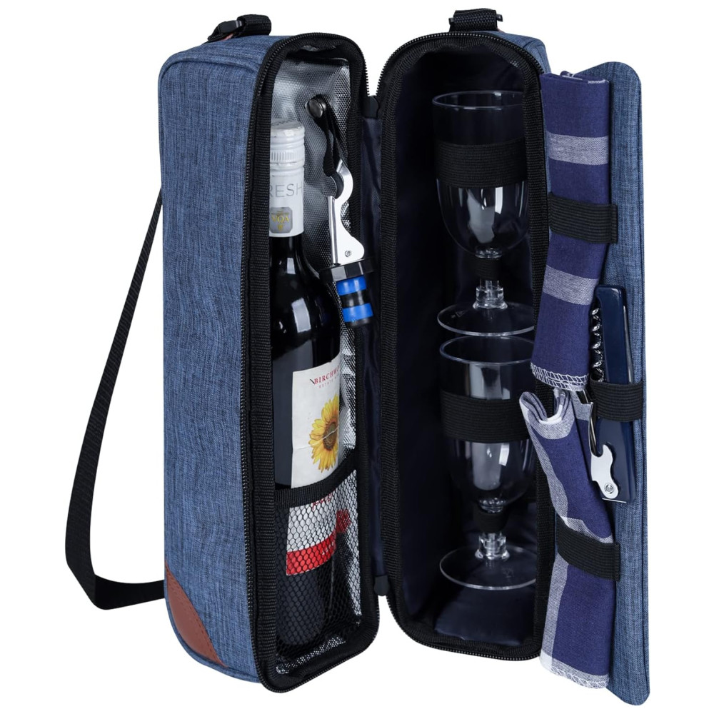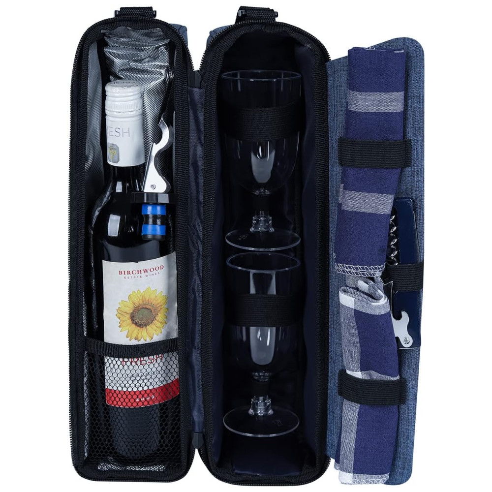 Tenha tudo que você precisa para um piquenique inesquecível com esta vibrante bolsa térmica para vinho em azul. Ela vem equipada com 2 taças de vinho de plástico, 1 saca-rolhas durável de aço inoxidável, 1 rolha para garrafa e 2 guardanapos. Perfeita para compartilhar uma garrafa de vinho ao ar livre com alguém especial. A bolsa possui um compartimento refrigerado que mantém suas bebidas geladas por até 57 horas, sendo ideal para piqueniques, dias de praia ou concertos ao ar livre. Com alça de ombro ajustável, é fácil de transportar. Compacta e portátil, mede 34cm de altura, 7,5cm de largura e 18cm de comprimento. Ideal para presentear em aniversários, aniversários ou feriados. Atenção: o vinho nas fotos é apenas para ilustração e não está incluído.