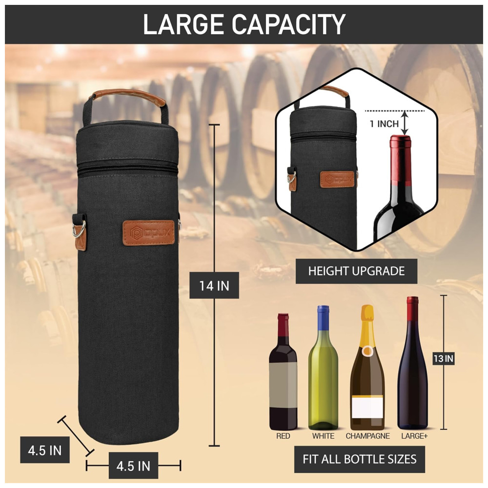 Leve o seu vinho com estilo para restaurantes, piqueniques ou onde quer que vá com a Bolsa Térmica Premium para 1 Garrafa de Vinho da OPUX. Equipada com alça de ombro removível e zíper, esta bolsa mantém a temperatura da sua garrafa de vinho ou champanhe. Leve e versátil, é perfeita para ocasiões especiais. Medindo 11,4 x 11,4 x 35,5 cm (L x A x P), a Bolsa Térmica da OPUX é feita com materiais de alta qualidade para simplificar a sua vida e garantir que seu vinho esteja sempre bem cuidado. Um presente ideal para entusiastas de vinho!