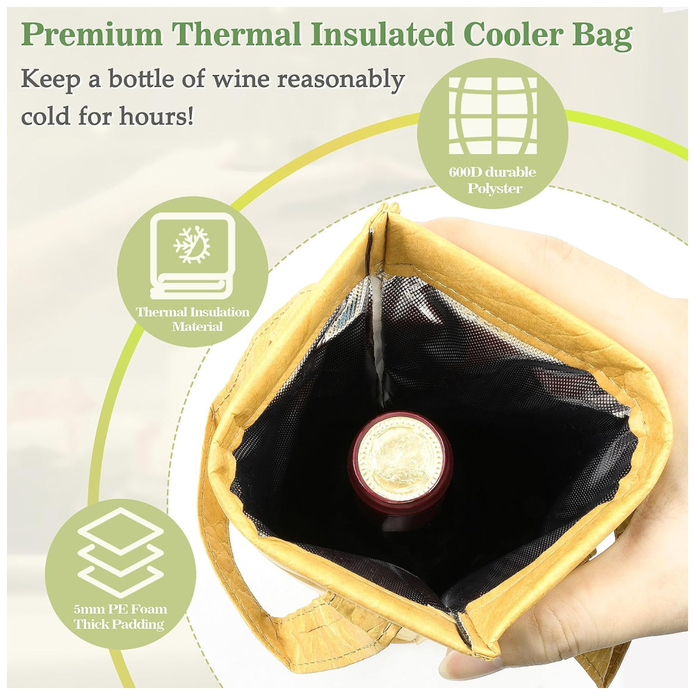A bolsa térmica para vinho da Tirrinia foi projetada para máxima portabilidade, com alça resistente que facilita o transporte de suas garrafas de vinho para qualquer lugar. Seja para uma festa, jantar, restaurante, piquenique, praia, concerto ou evento esportivo, este porta-garrafas de vinho garante que sua bebida favorita viaje com estilo. Além de ser perfeito para viagens, passeios e celebrações, essa bolsa também funciona como refrigerador para água, cerveja e refrigerantes, sendo essencial para qualquer ocasião.