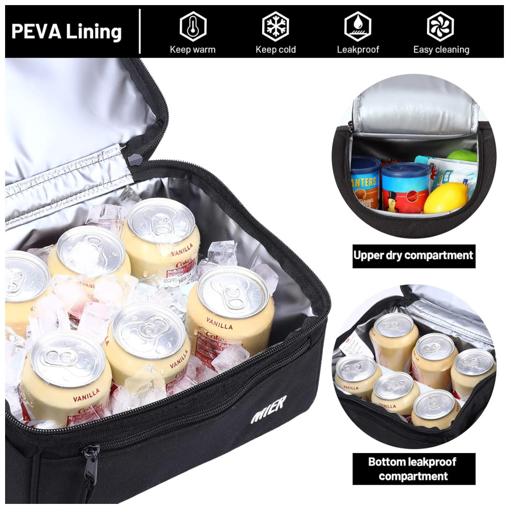 Saco de almoço com 2 compartimentos A seção seca superior possui uma abertura em U e zíper duplo para acesso automático, ideal para itens que não vazam, como frutas, lanches ou tortas. A seção fria inferior é isolada sem vazamentos com forro macio de PEVA, perfeito para bebidas, água, suco e afins. Fácil de limpar