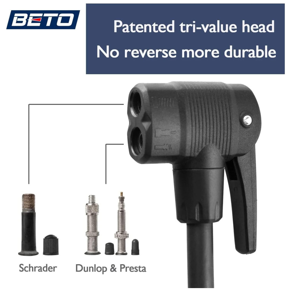 Facilidade de fixação, desconexão A bomba de bicicleta vem com uma excelente cabeça de bomba chamada AH4 cabeça automática patenteada. A cabeça se conecta automaticamente às válvulas Schrader, Presta e Dunlop sem nenhum ajuste. Empurre a cabeça para baixo em qualquer válvula que você tenha, trave a alavanca e comece a bombear