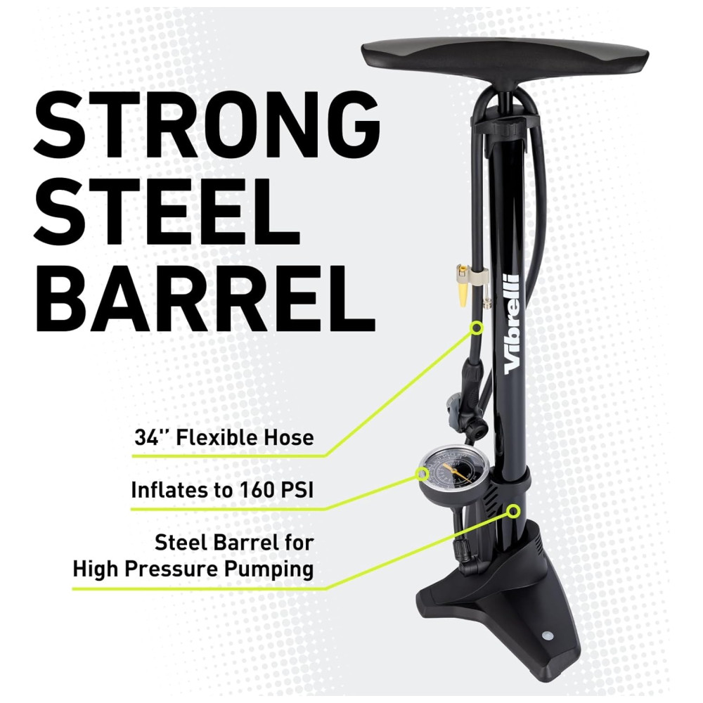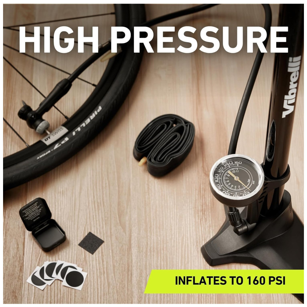 Infla a 160 PSI Com um cano de aço forte e alça reforçada, a bomba de pneu de bicicleta da Vibrelli é testada quanto à precisão de alta pressão, é a bomba de bicicleta de estrada perfeita