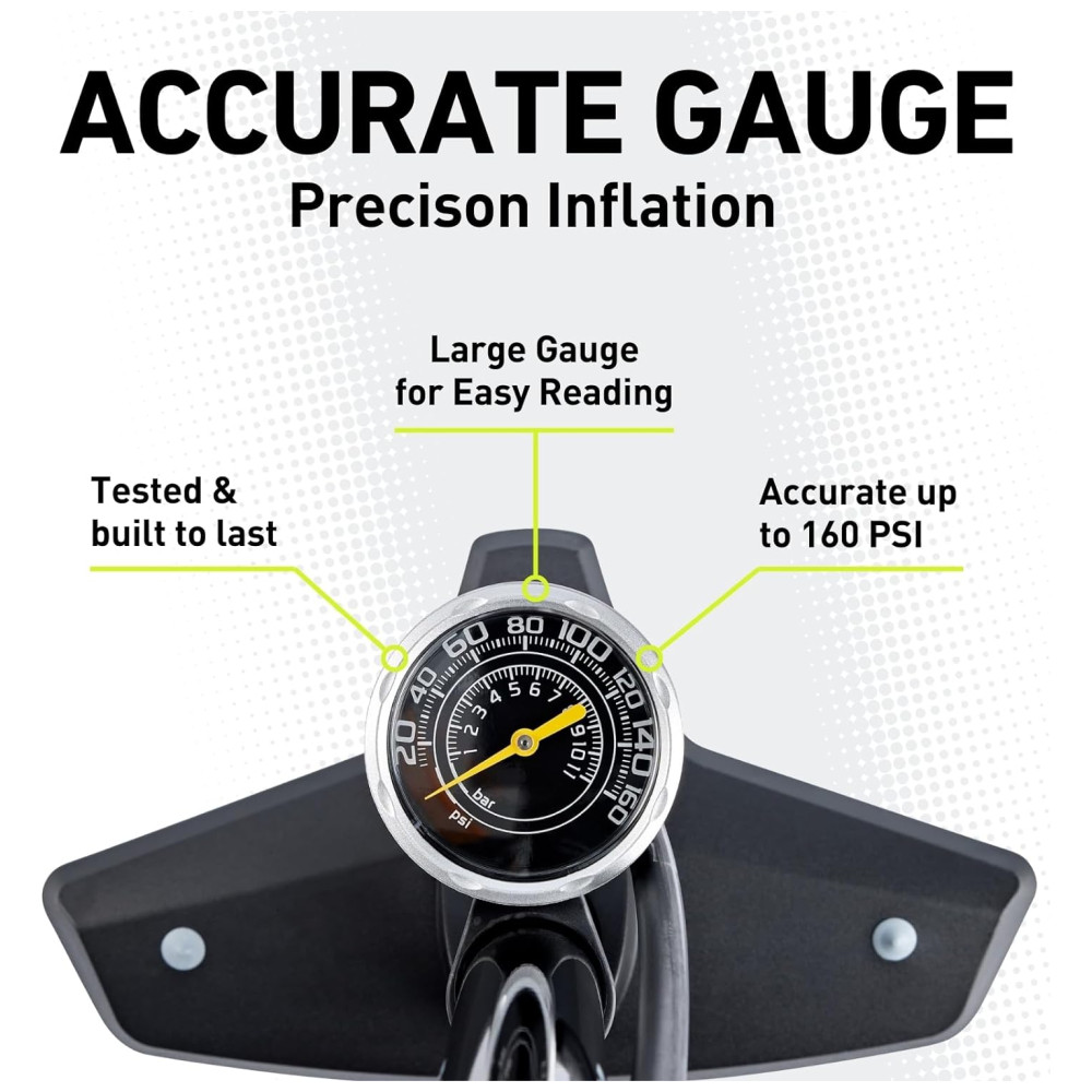Grande medidor de precisão a bomba de bicicleta da Vibrelli com medidor é construída e testada para precisão de alta pressão. O medidor de pressão da bomba de bicicleta é grande, preciso e fácil de ler.