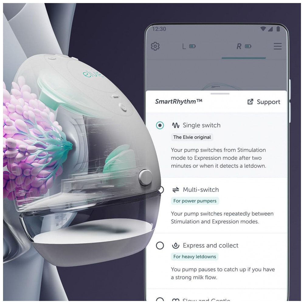SMART Conecte se ao aplicativo gratuito Elvie Pump para monitorar o volume de leite em tempo real, rastrear o histórico de extração de cada mama e controlar a extração remotamente.